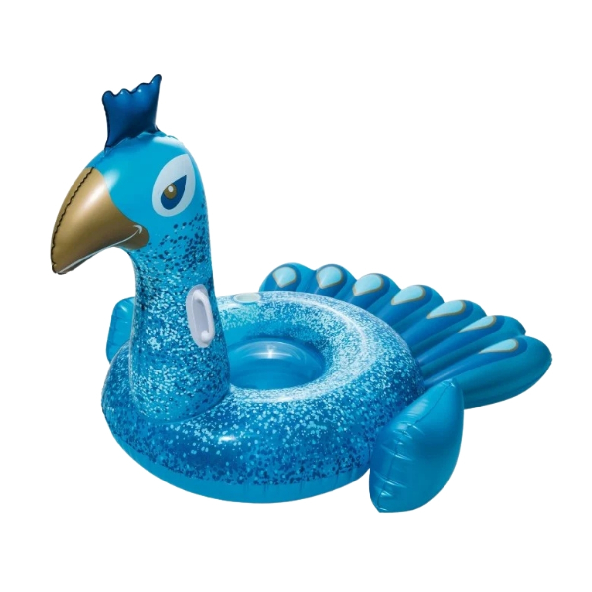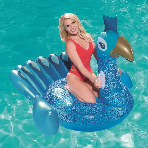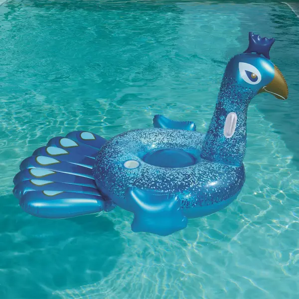 Flyt runt med stil i sommar! Denna stora uppblåsbara påfågel är perfekt för poolhäng och poolfester – med handtag och mugghållare för maximal komfort.