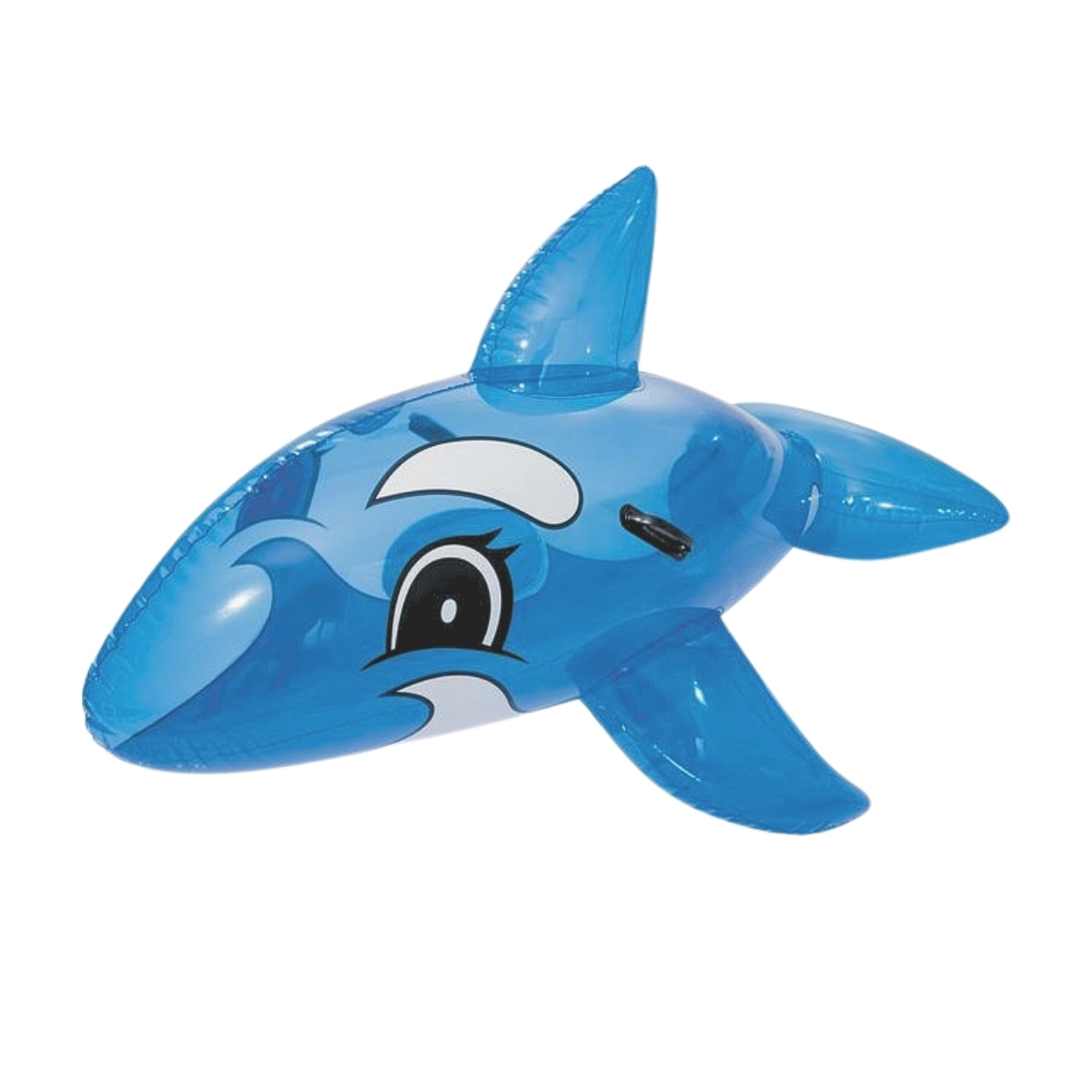 Den uppblåsbara fenan och sidodelarna hjälper till att ge stabilitet i vattnet, vilket gör det lättare att sitta kvar och njuta av turen. Den lekfulla designen med ett glatt uttryck gör baddjuret till en riktig favorit under sommarens alla vattenäventyr.