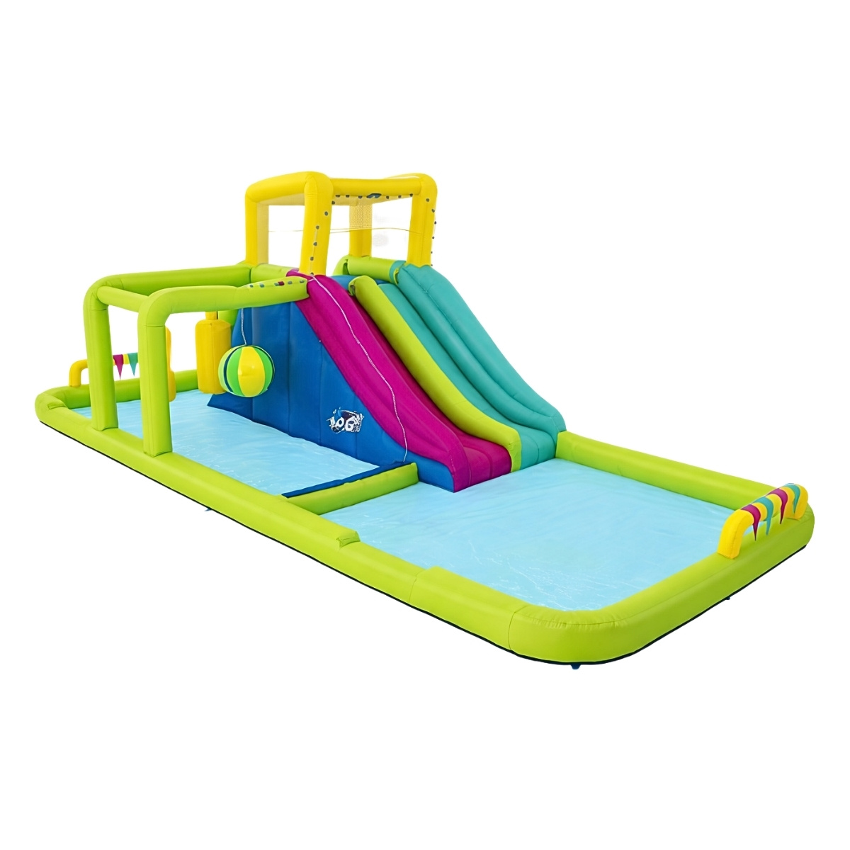 Bestway H2OGO! Splash Course är en stor och färgstark uppblåsbar vattenpark som bjuder på fartfylld lek och roliga tävlingar under varma sommardagar. Här kan barn klättra, glida, springa och tävla genom en spännande hinderbana fylld med olika vattenaktiviteter.