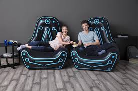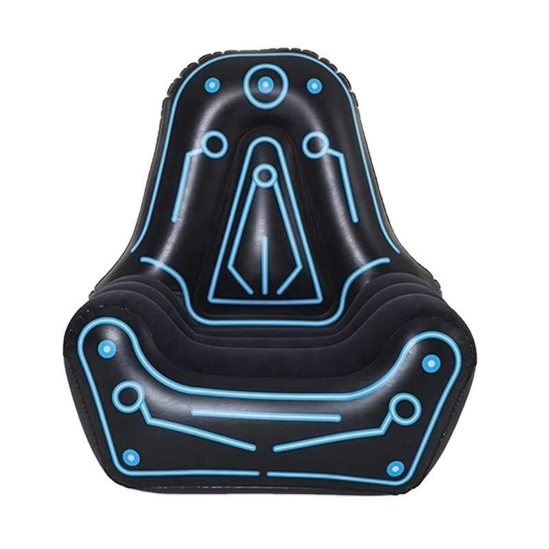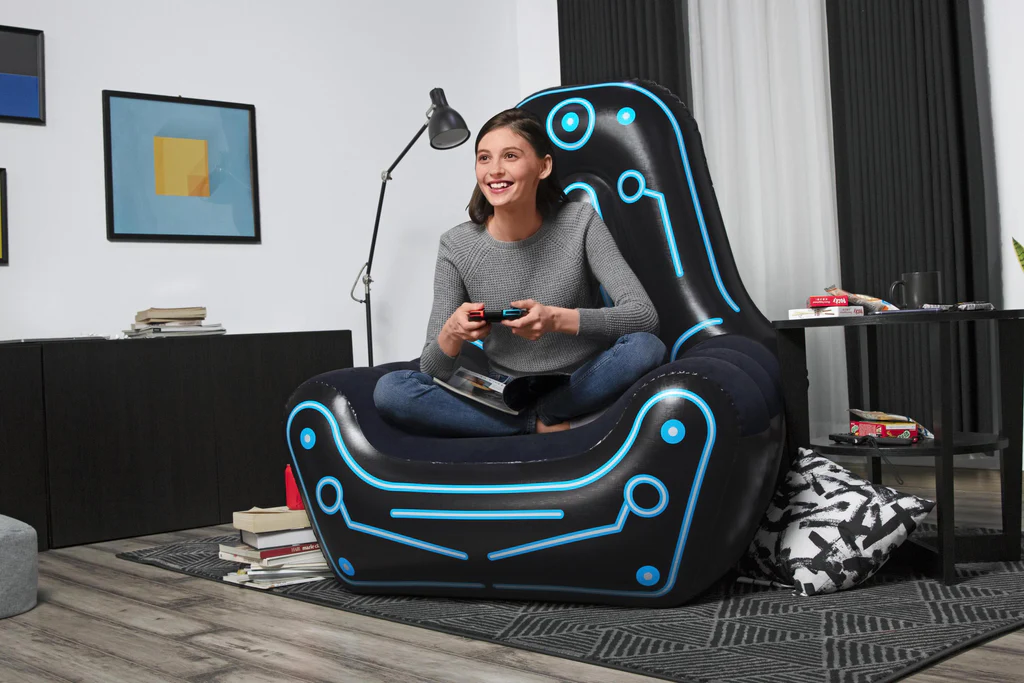 Uppblåsbar gamingstol Bestway – perfekt för långa TV- och spelpass! Den svarta stolen är portabel, bekväm och rolig, med stora arm- och ryggstöd för avkoppling.