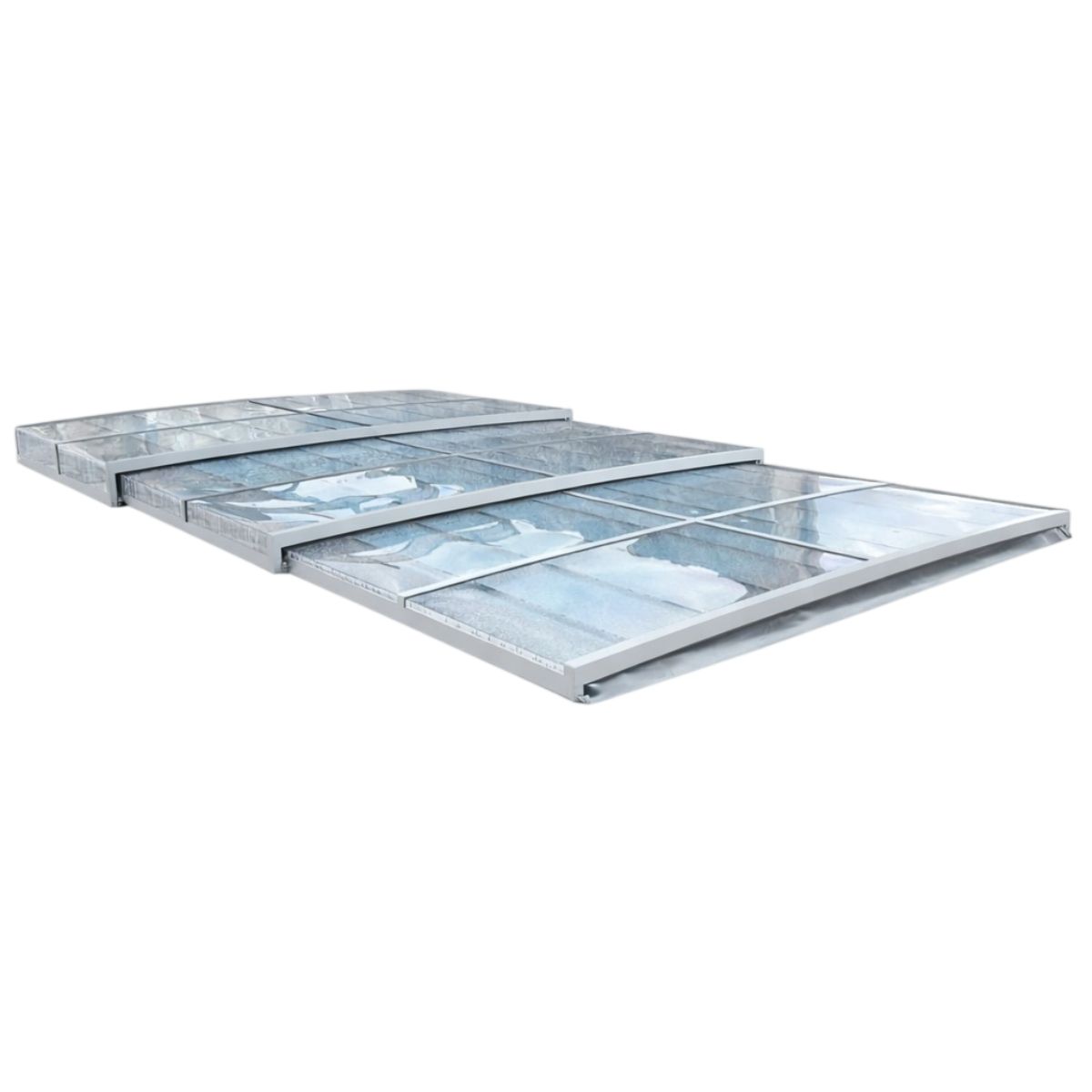 Pooltaket är tillverkat av mattlackerade aluminiumprofiler i aluminiumvit (RAL9006) och paneler i 4 mm klar UV-beständig polykarbonat, vilket ger en elegant finish samtidigt som poolen skyddas från smuts, löv och nederbörd.