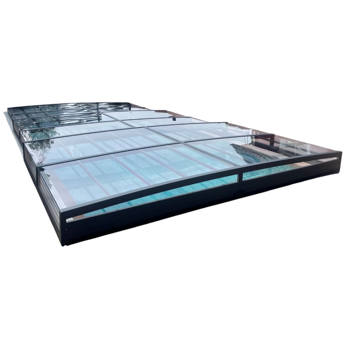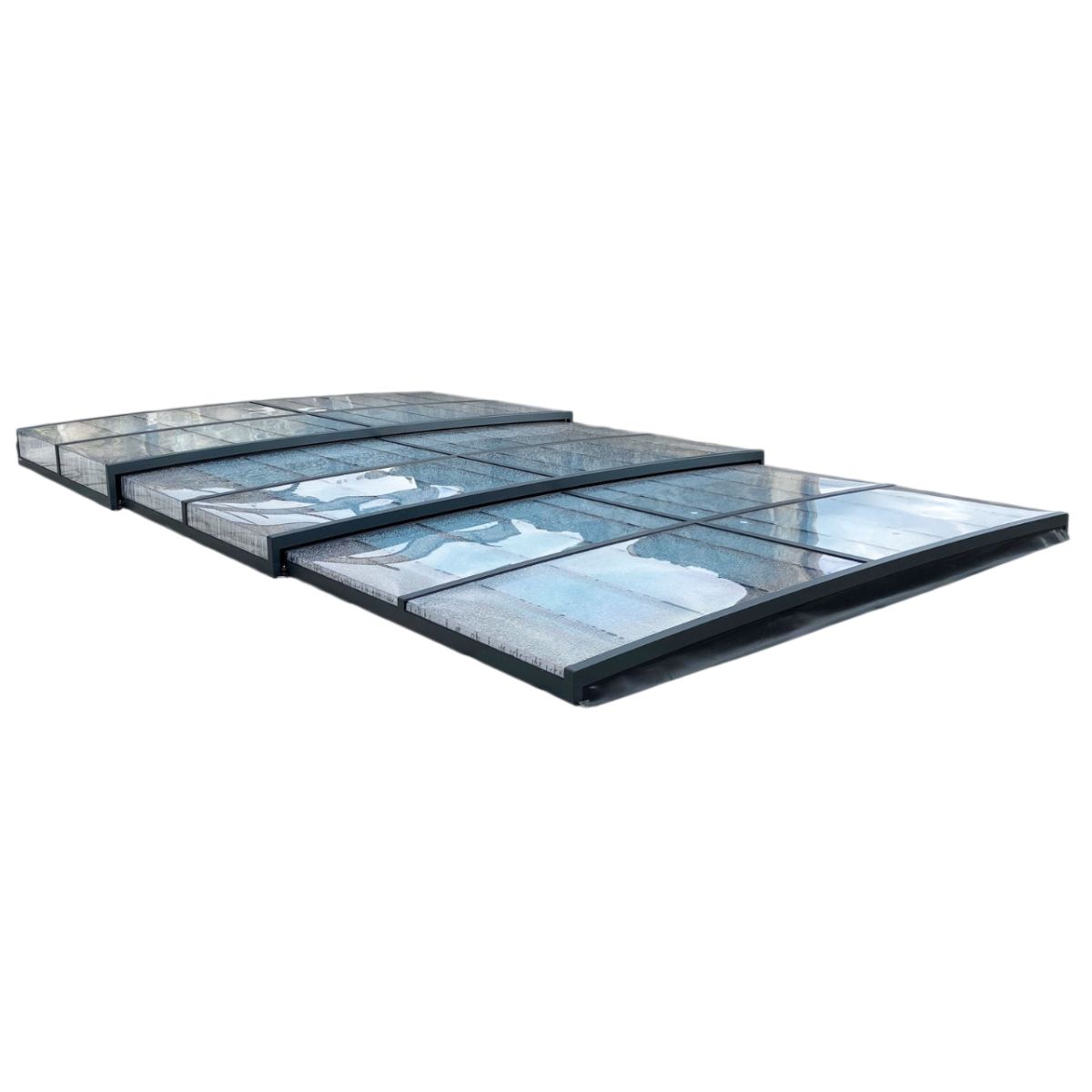 Pooltaket är tillverkat av mattlackerade aluminiumprofiler i antracit (RAL7016) och paneler i 4 mm klar UV-beständig polykarbonat, vilket ger en elegant finish samtidigt som poolen skyddas från smuts, löv och nederbörd.