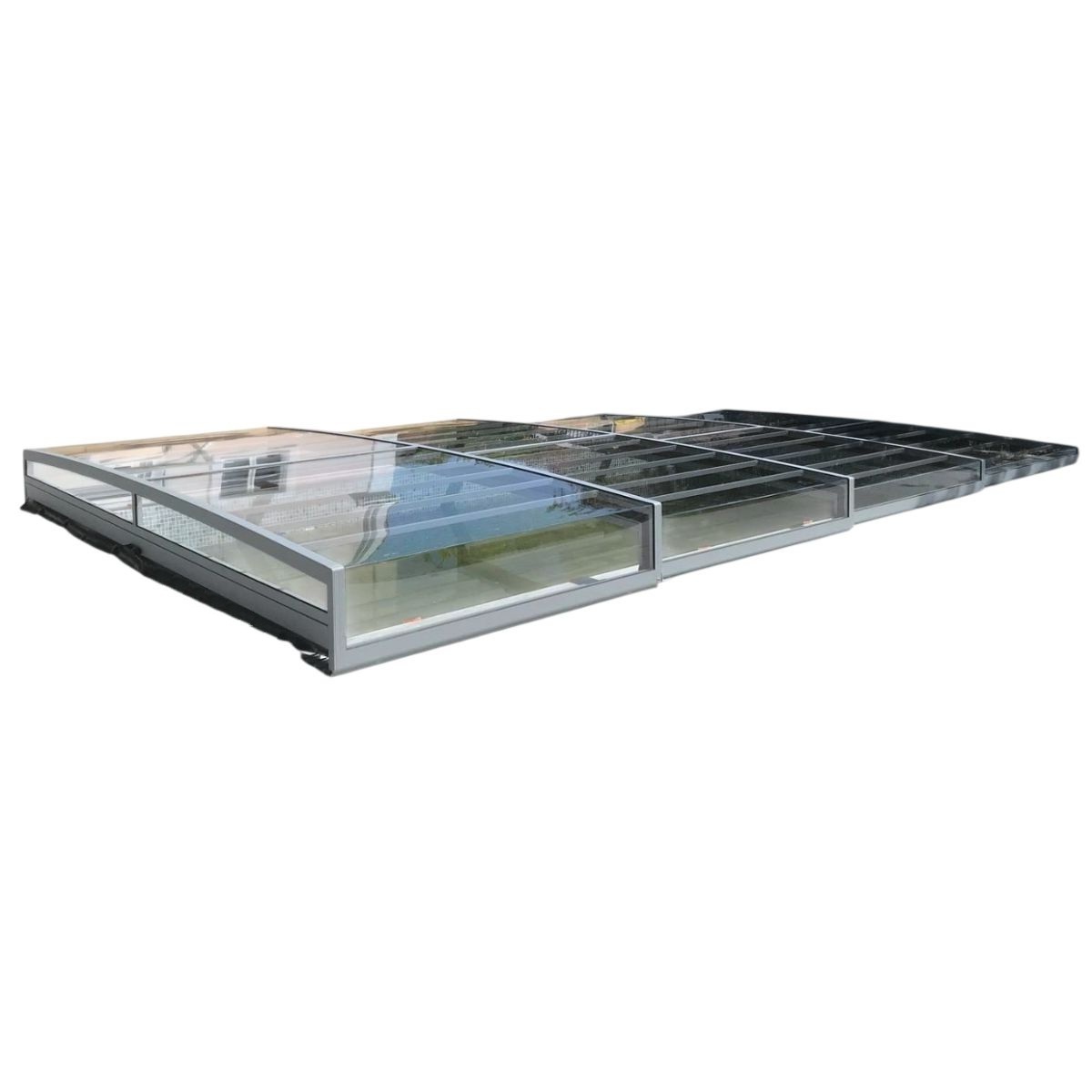 Pooltaket är tillverkat av mattlackerade aluminiumprofiler i aluminiumvit (RAL9006) och paneler i 4 mm klar UV-beständig polykarbonat, vilket ger en elegant finish samtidigt som poolen skyddas från smuts, löv och nederbörd.