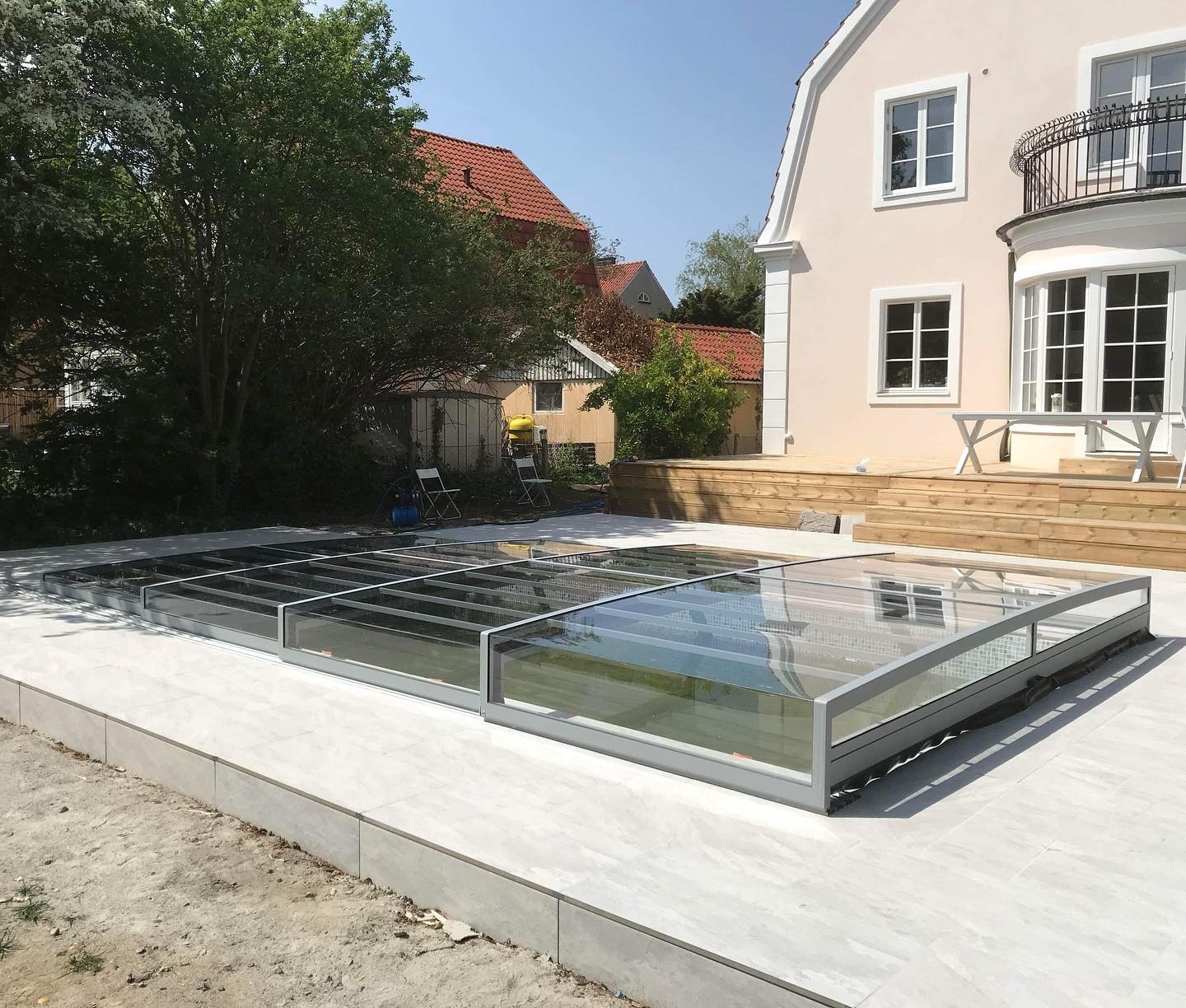 Exklusivt och stilrent pooltak i aluminiumvit – ett av marknadens lägsta pooltak.