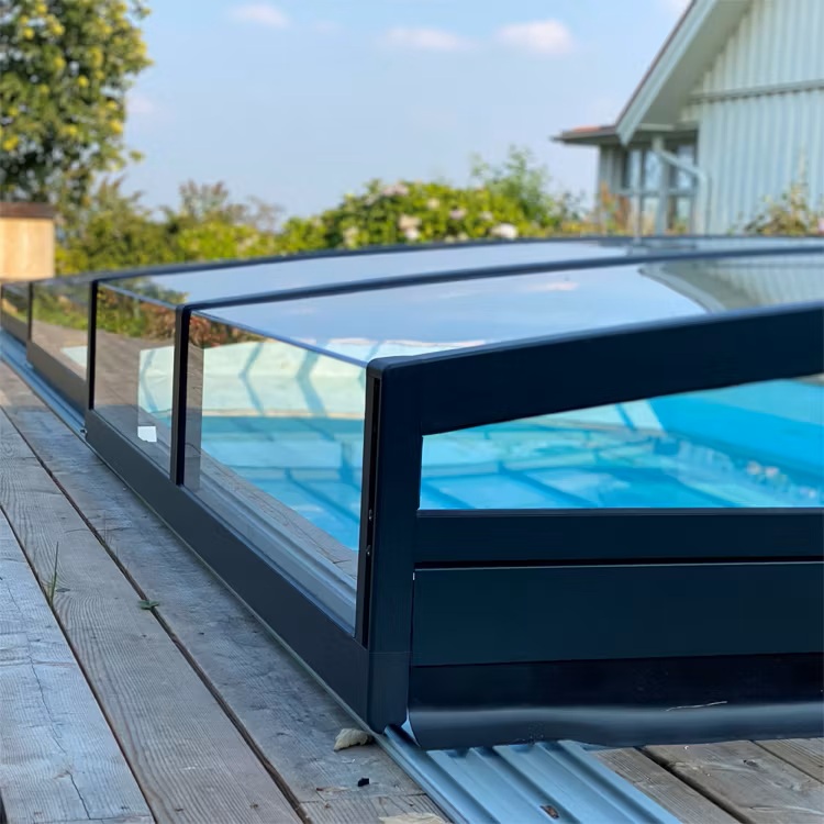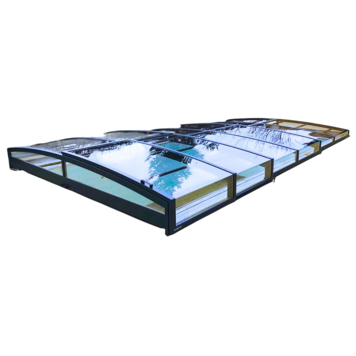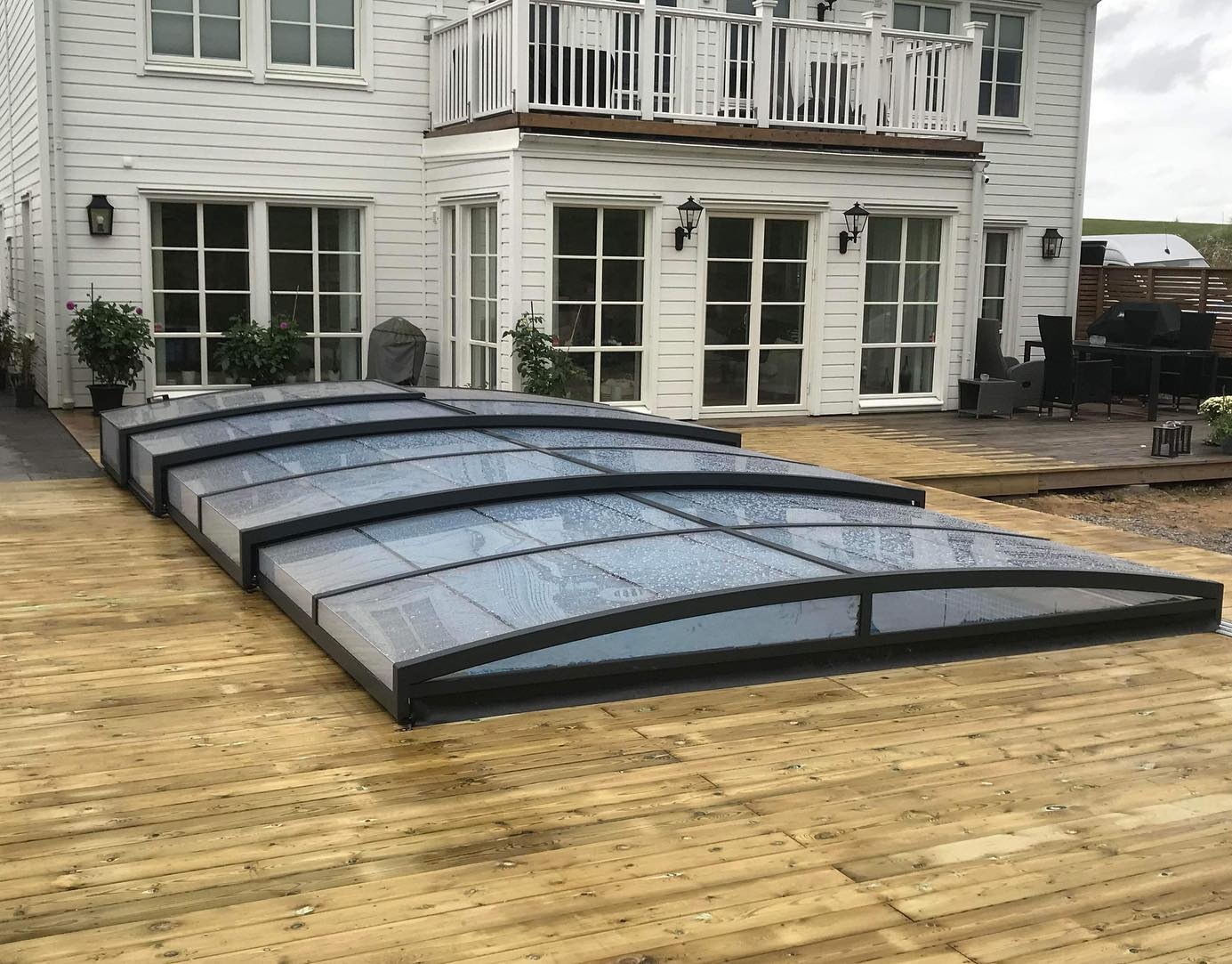 Ett exklusivt och lågt pooltak i antracit för pooler på 3×6,5 m och 3,5×7 m.