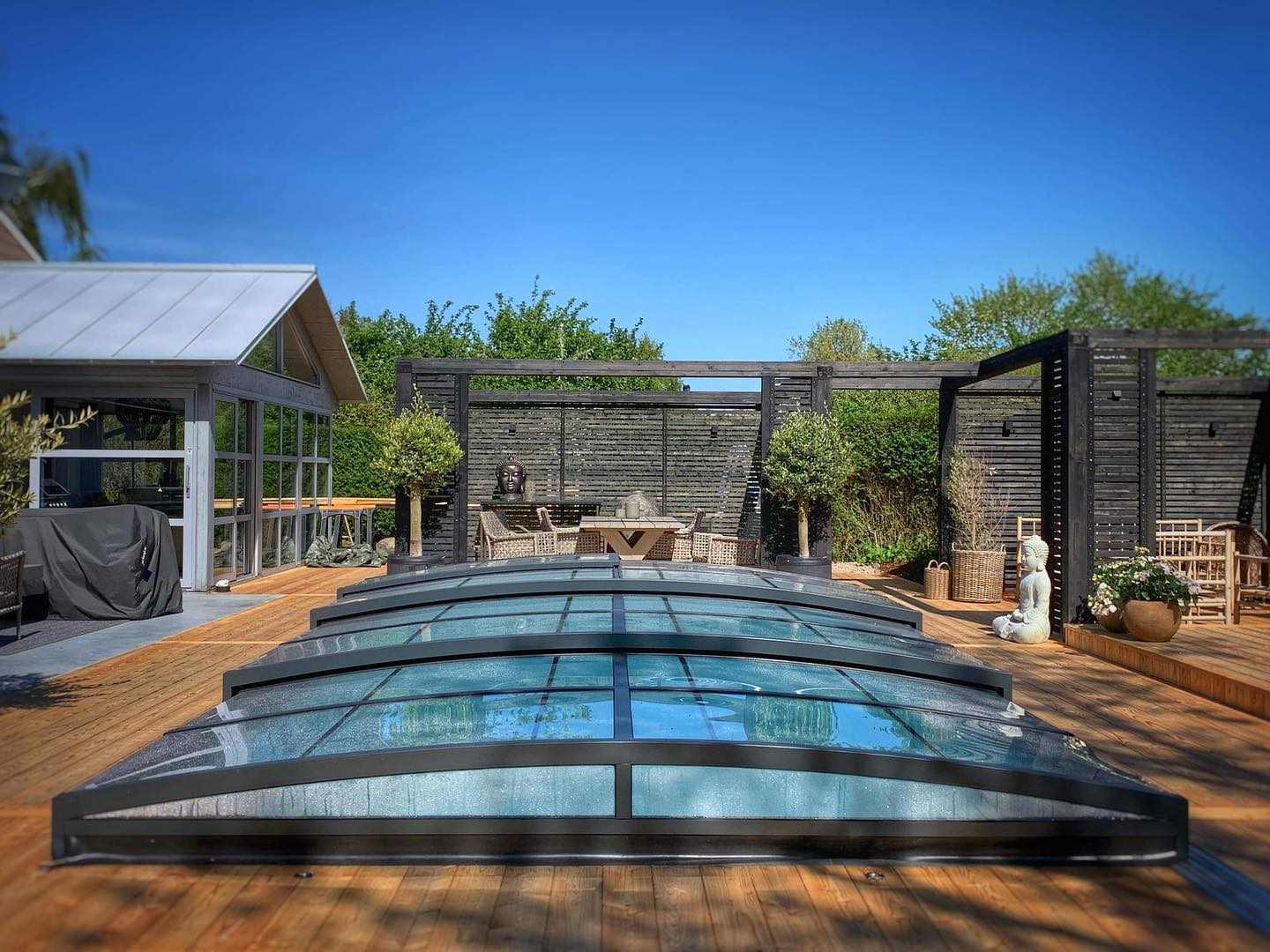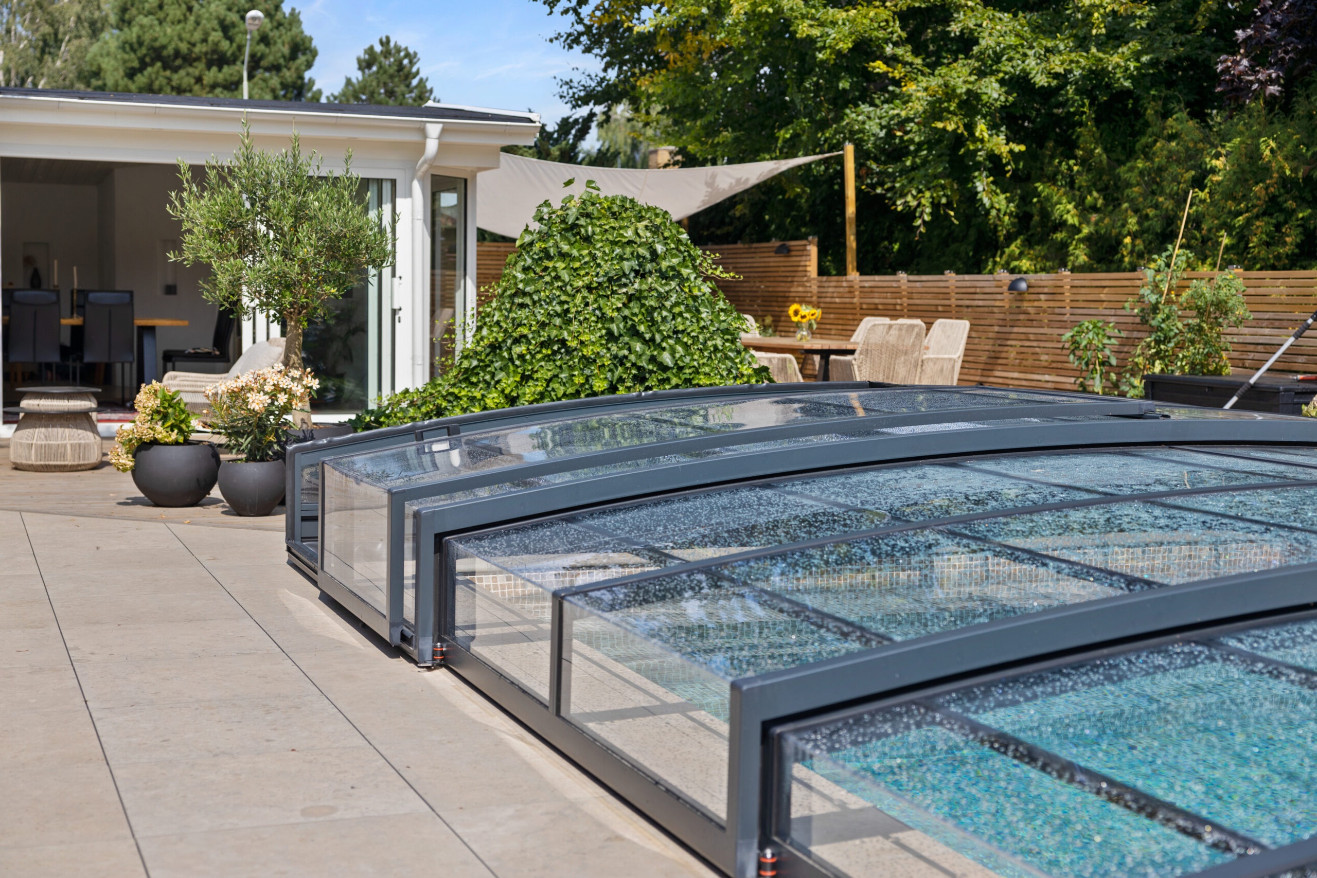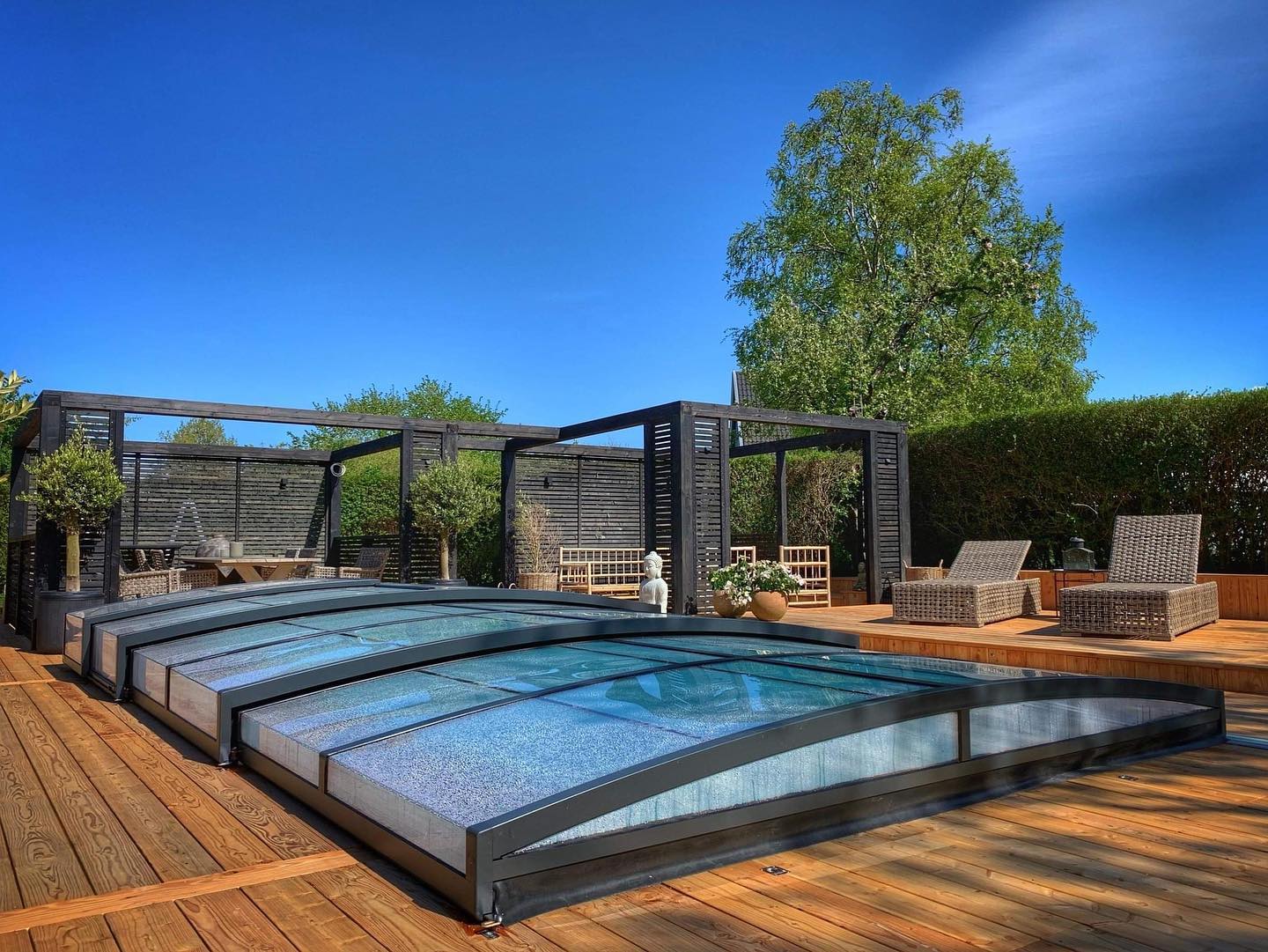 Ett exklusivt och lågt pooltak i antracit för pooler på 3×6,5 m och 3,5×7 m.