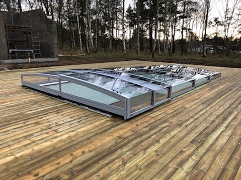 Ett exklusivt och lågt pooltak i aluminiumvit för pooler på 3,5×7,5 m och 4×8 m.