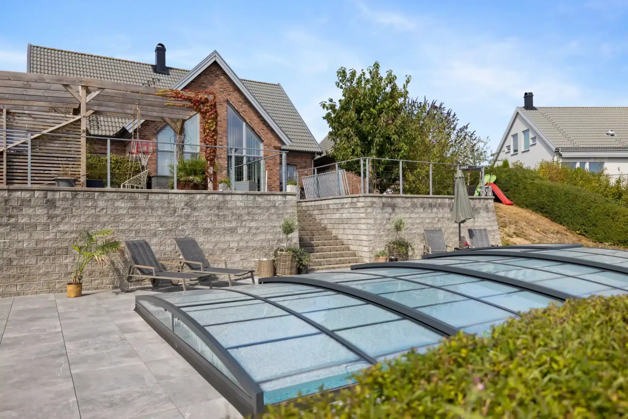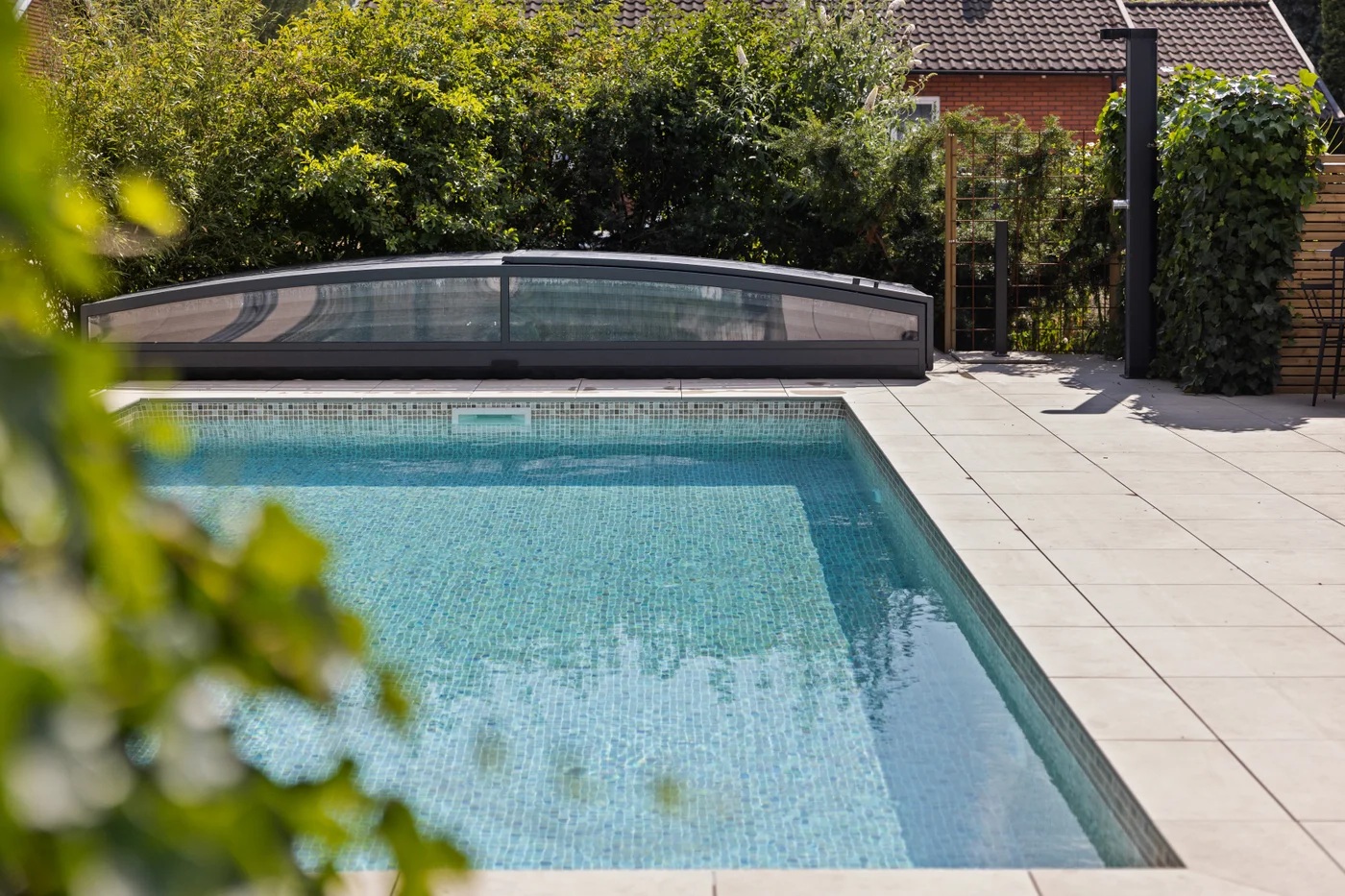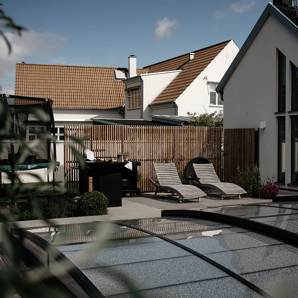 Leia är ett exklusivt lågt pooltak i klar polykarbonat med mattlackerade aluminiumprofiler i antracit (RAL7016). Tack vare den diskreta designen smälter taket naturligt in i trädgården, samtidigt som det skyddar poolen mot smuts, löv och nederbörd.