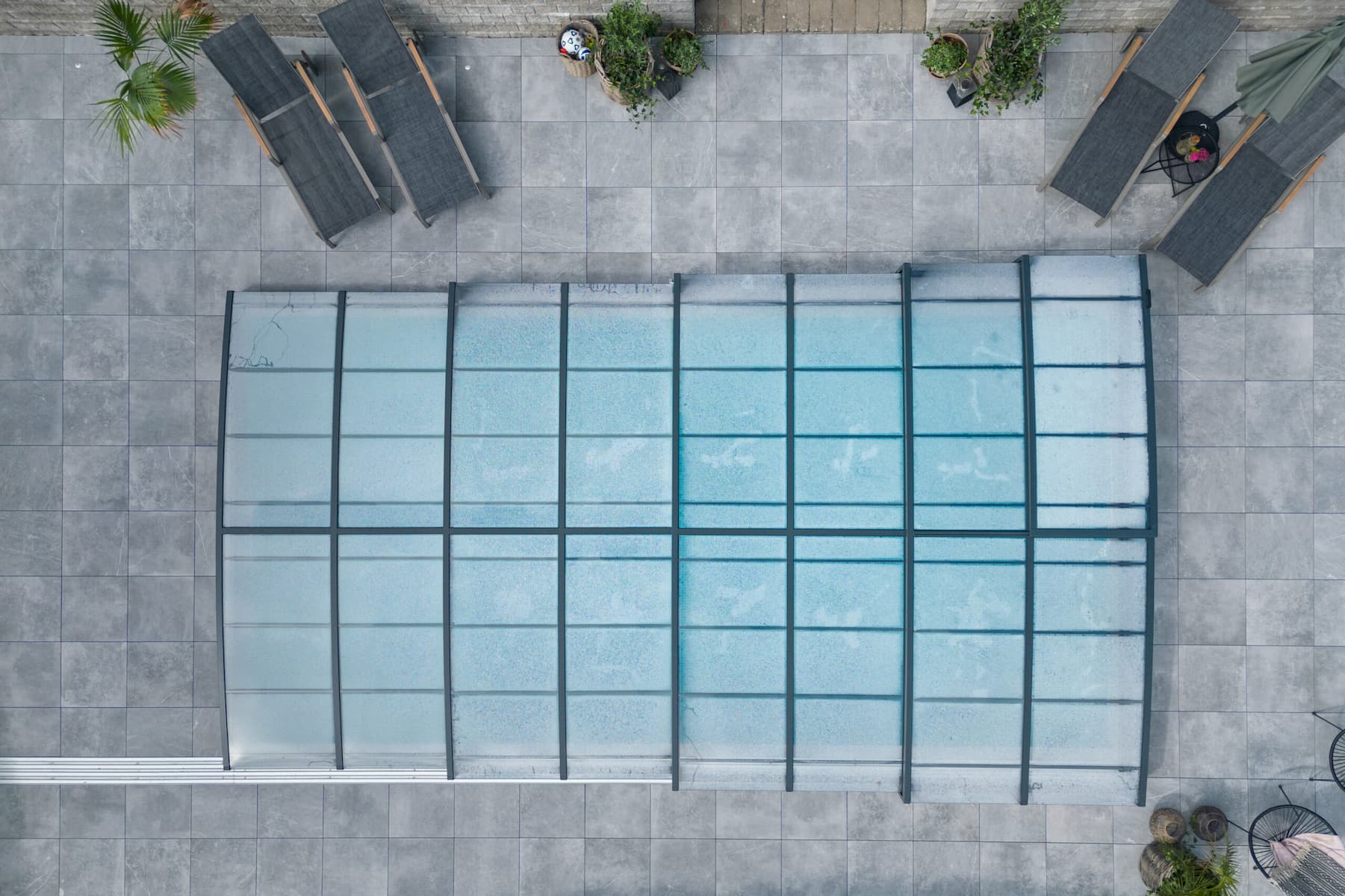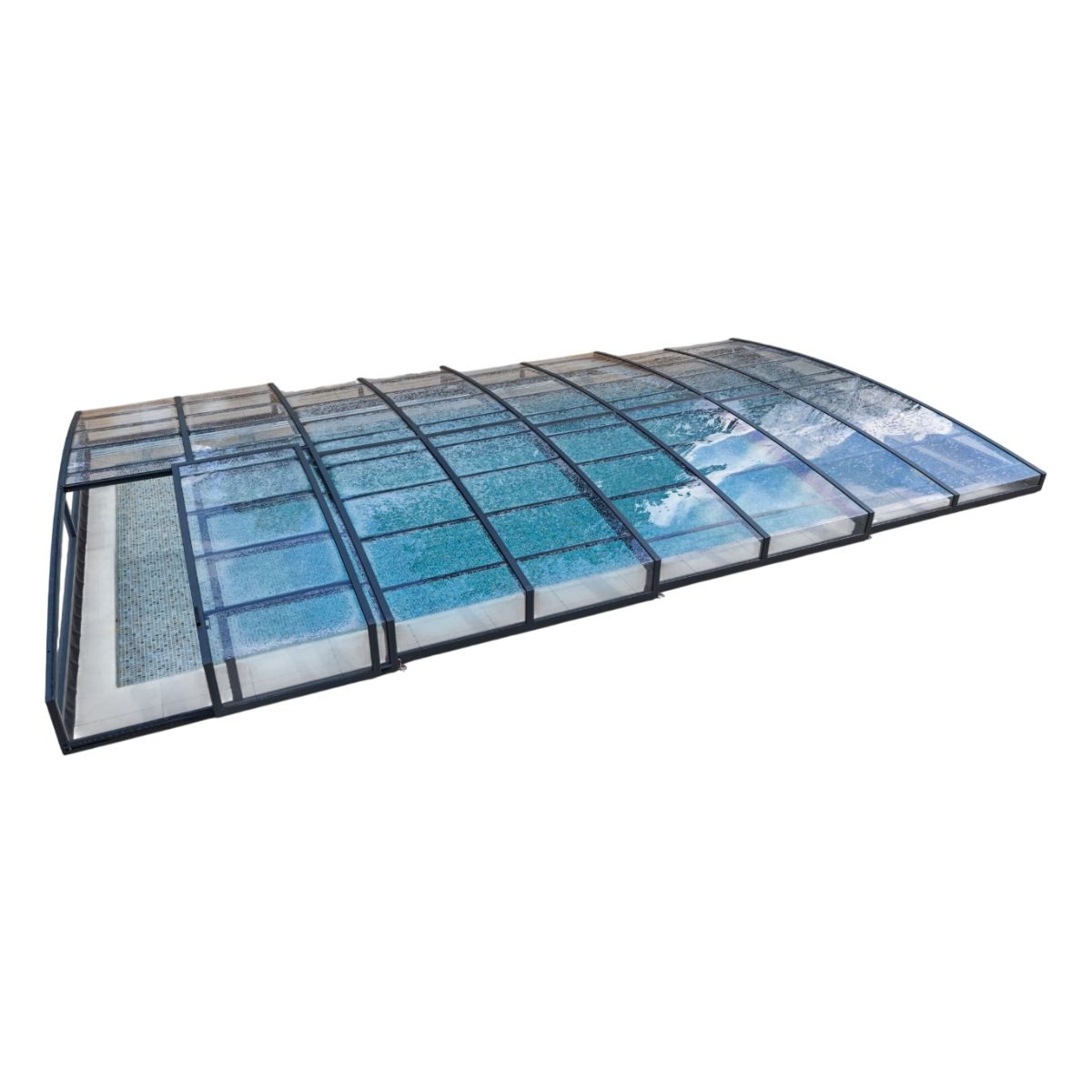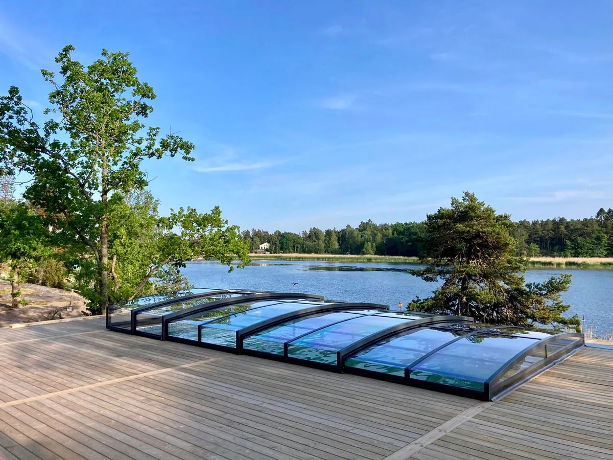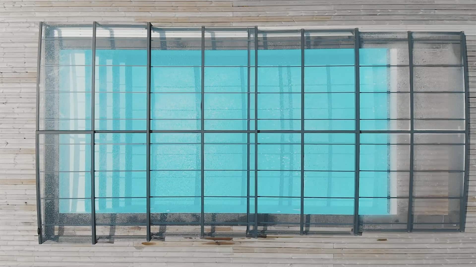 Ett exklusivt och lågt pooltak i antracit för pooler på 3,5×7,5 m och 4×8 m.