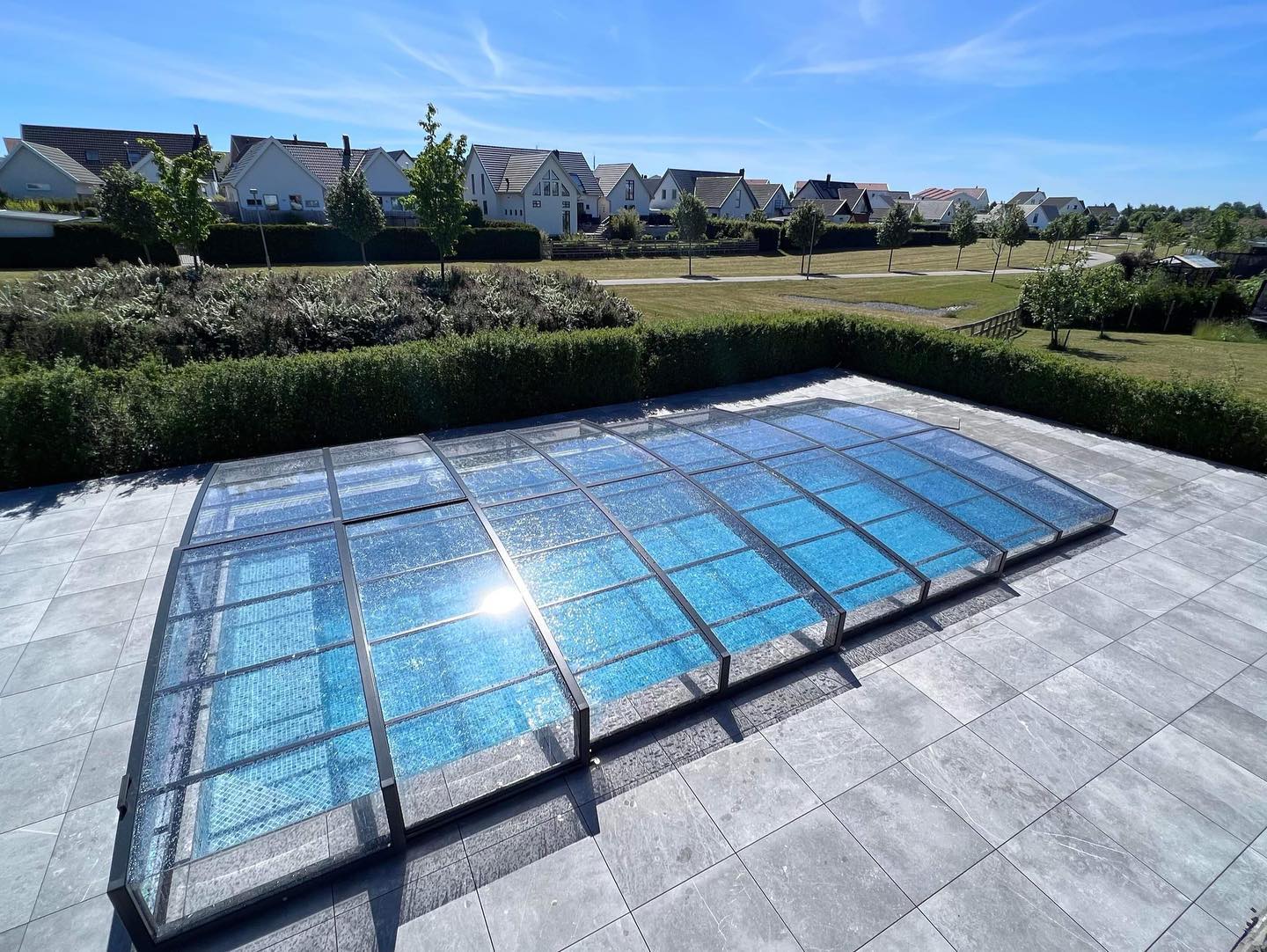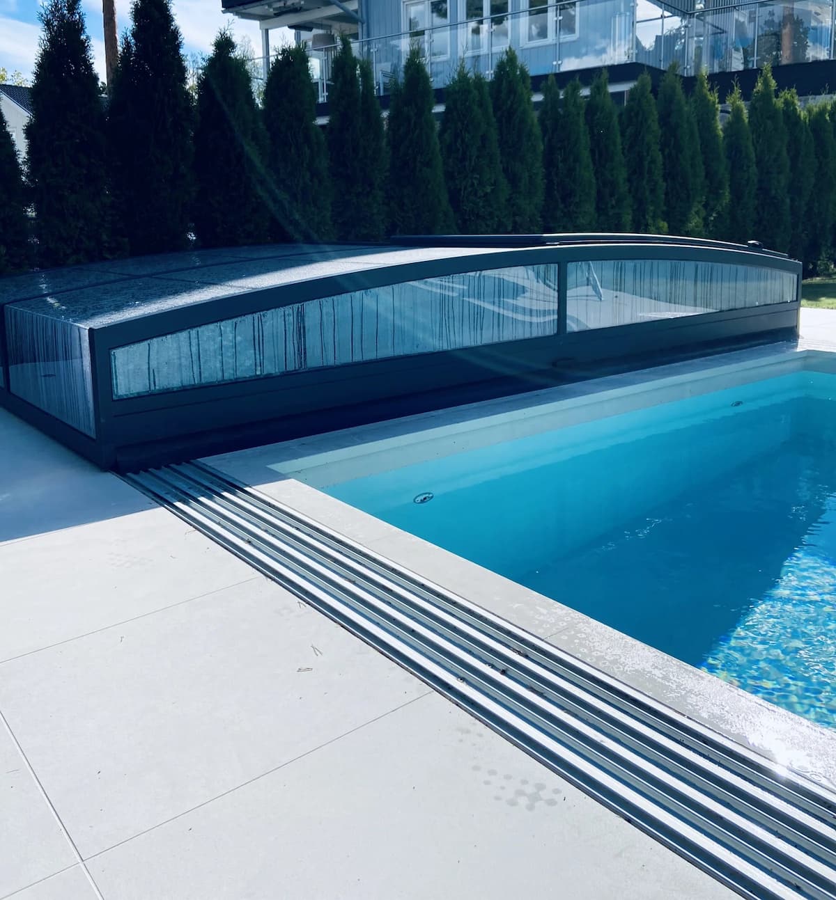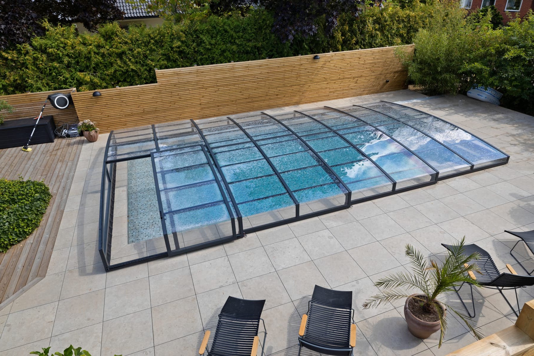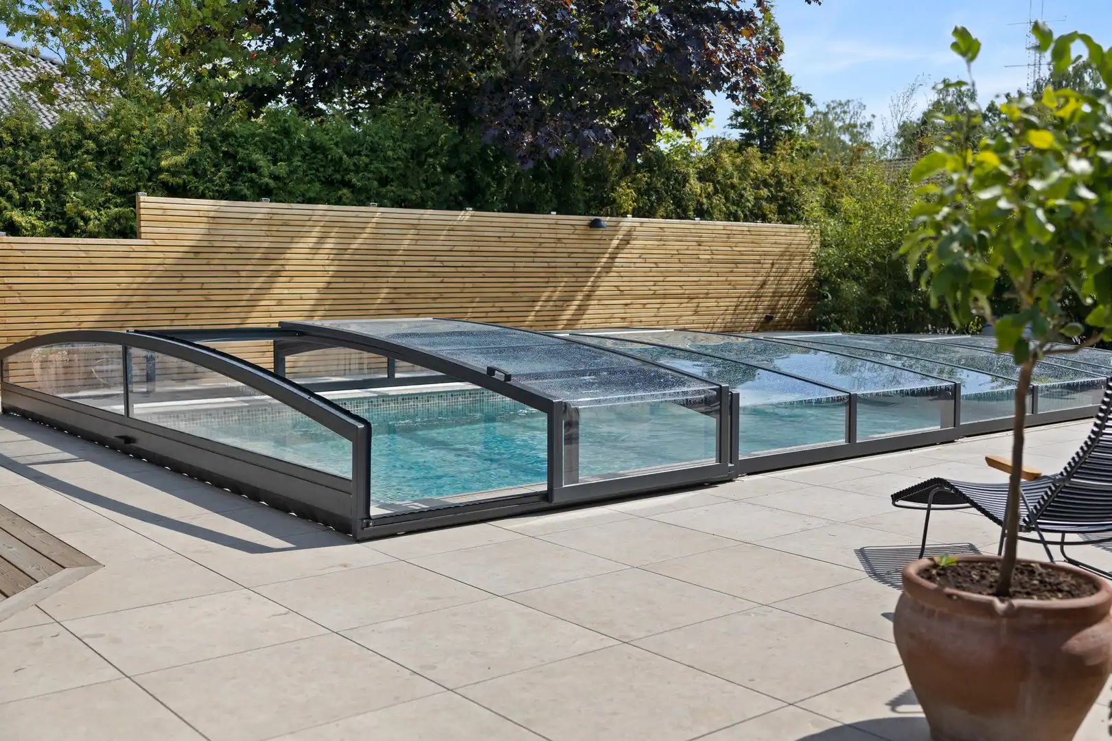 Ett exklusivt och lågt pooltak i antracit för pooler på 3,5×7,5 m och 4×8 m.