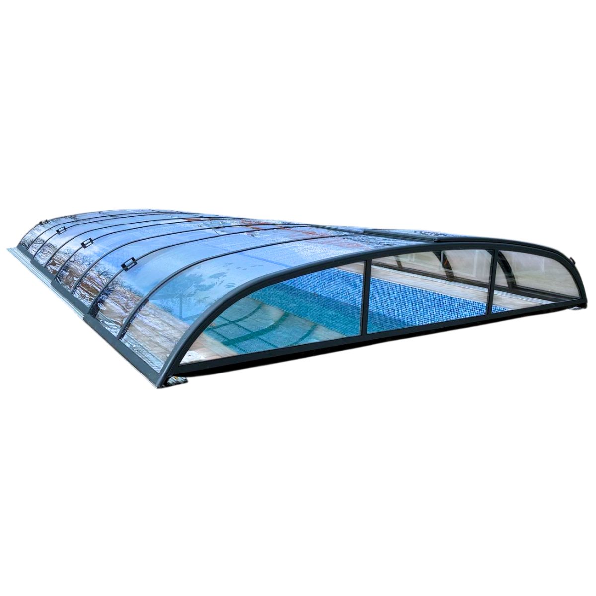Ett stilrent och robust pooltak i antracit för pooler på 3,5×7,5 m och 4×8 m.