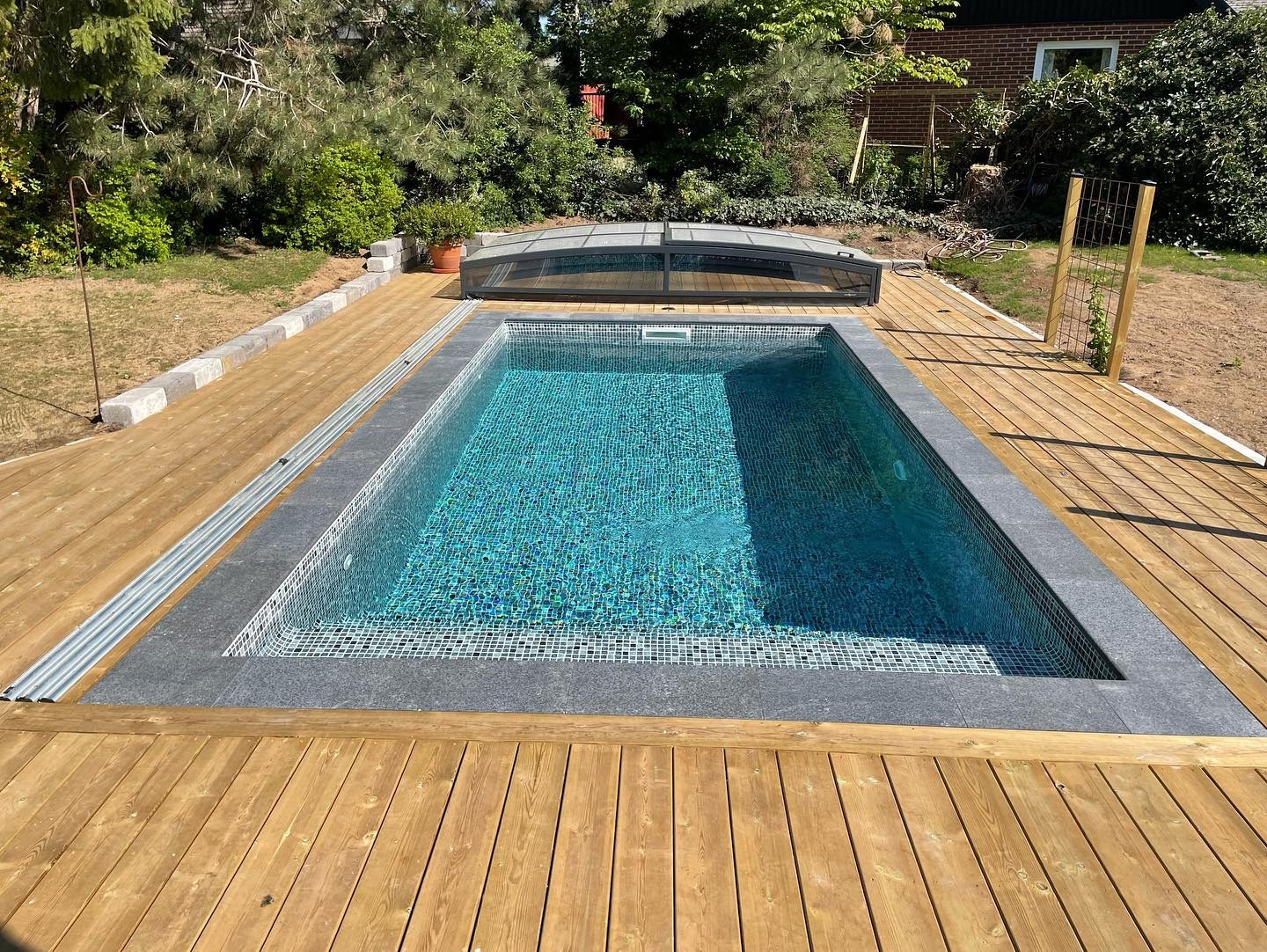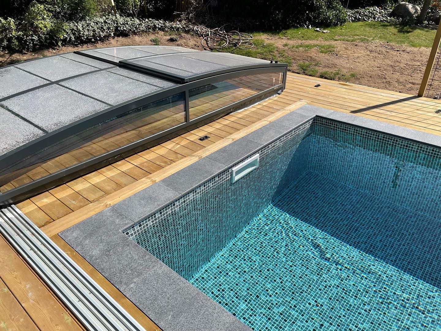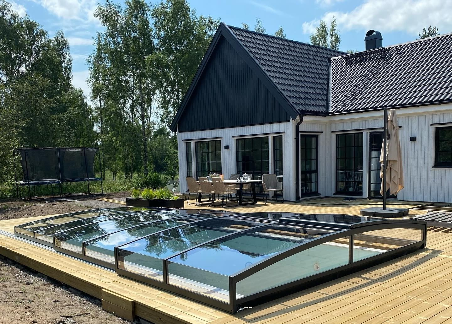 Ett stilrent och lågt pooltak i antracit för pooler på 3×6 m och 3,5×6,5 m.