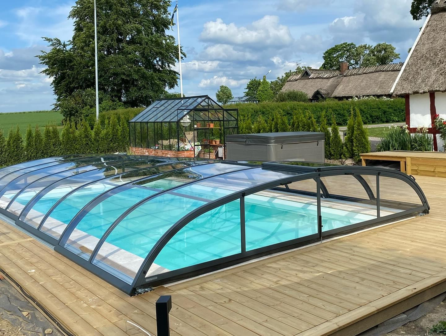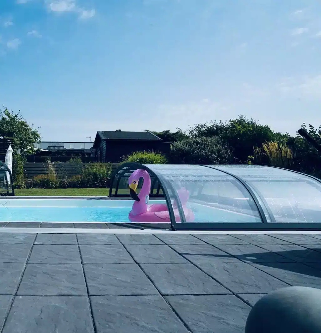 Pooltak Nova Comfort från Gullberg & Jansson har extra platta komfortskenor (12 mm), 3 mm klar UV-beständig polykarbonat och automatisk sektionslåsning för smidig användning och barnsäkerhet.