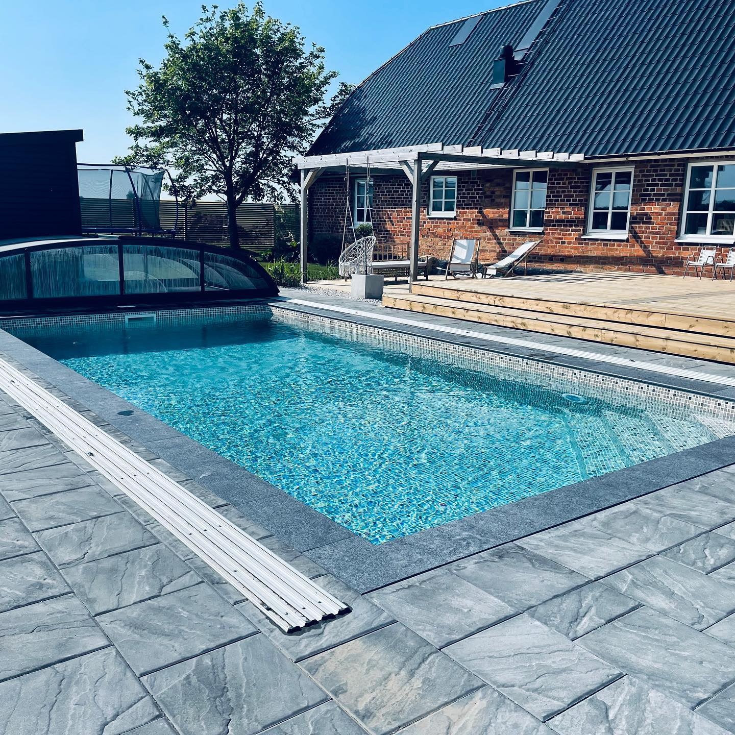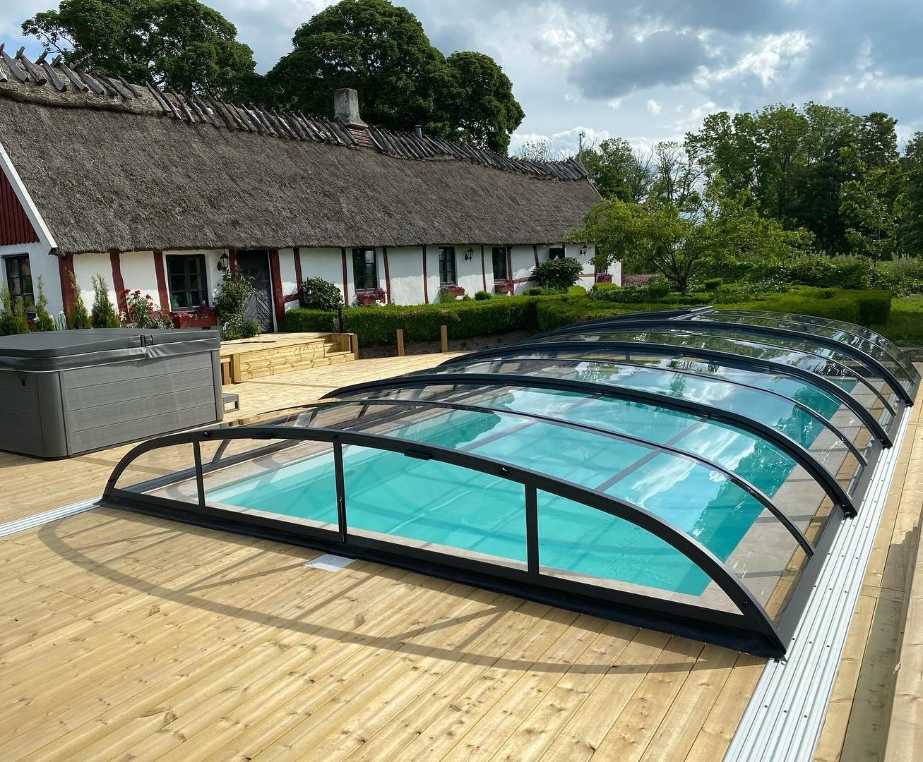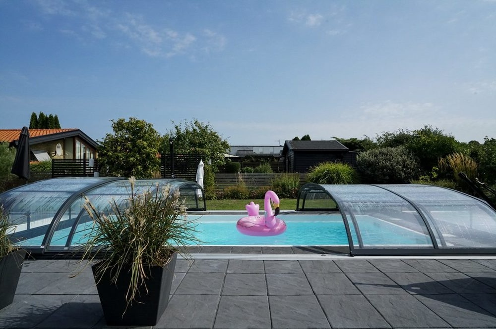 Ett stilrent och robust pooltak i antracit för pooler på 3,5×7 m, 4×7 m och 4×7,5 m.