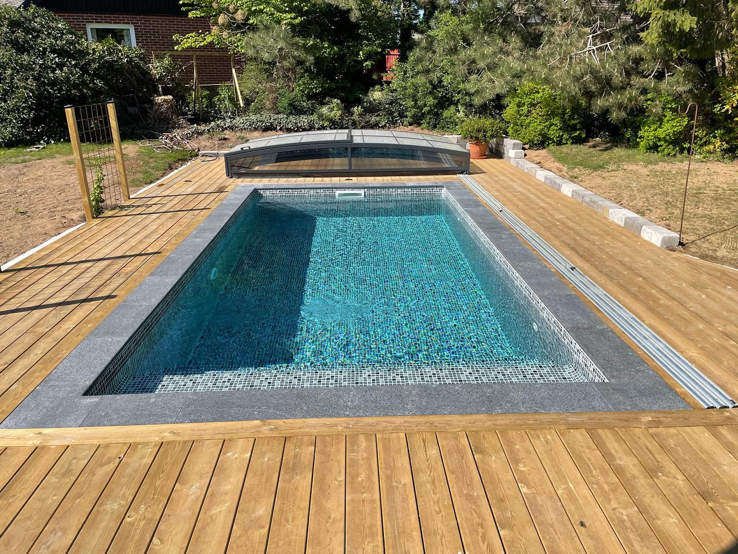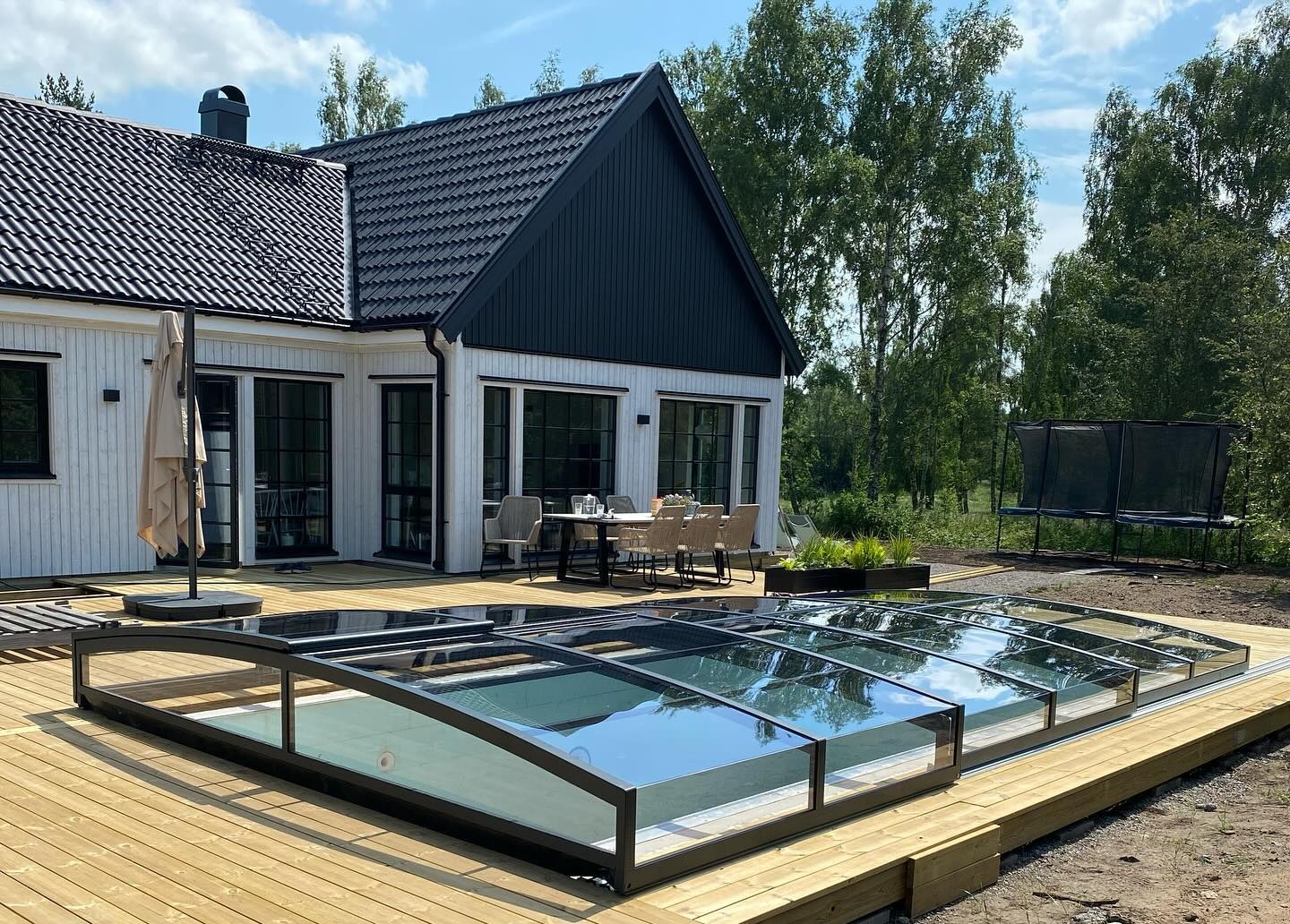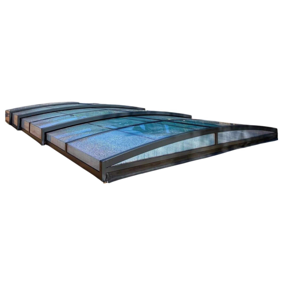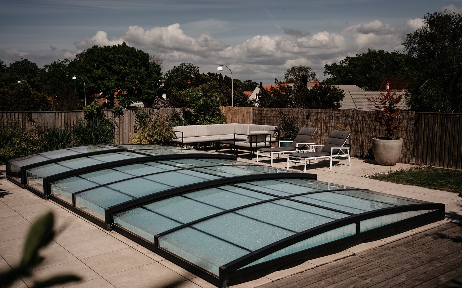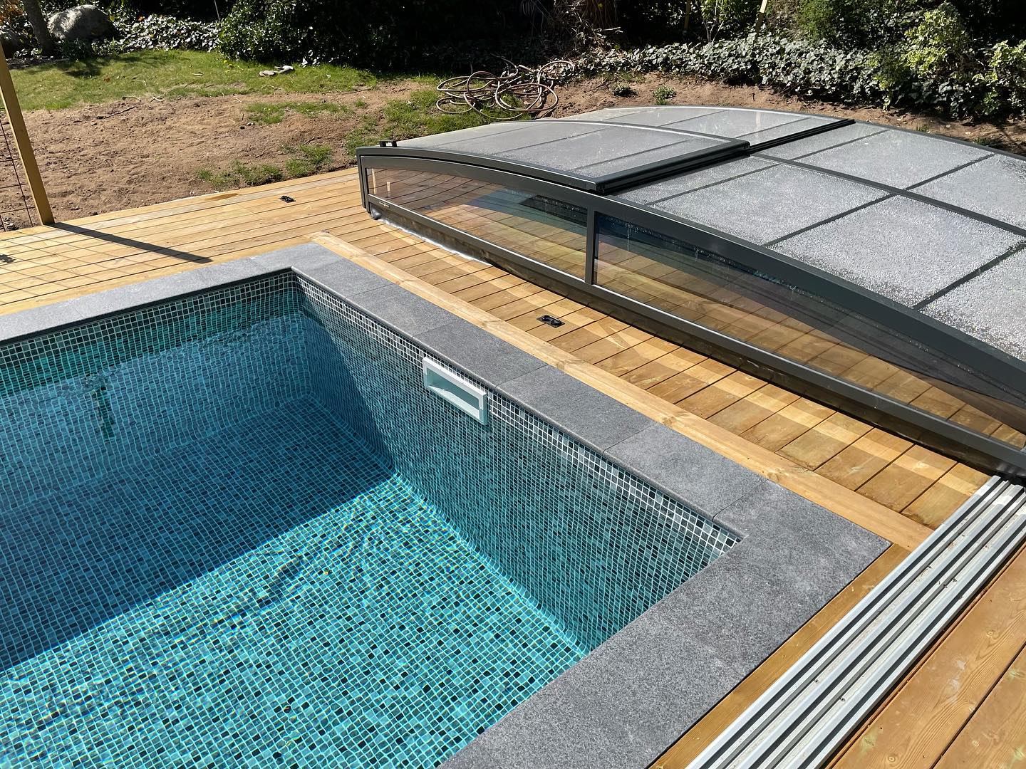 Ett stilrent och lågt pooltak i antracit för pooler på 3×6 m och 3,5×6,5 m.