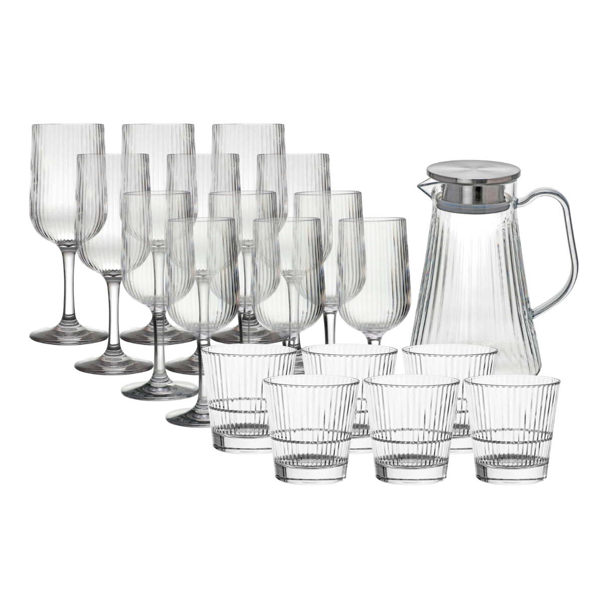 Njut av vin utan risk för krossade glas! Stora vinpaketet innehåller 6 glas av varje sort och 1 bringare (totalt 18 okrossbara glas i plast):
