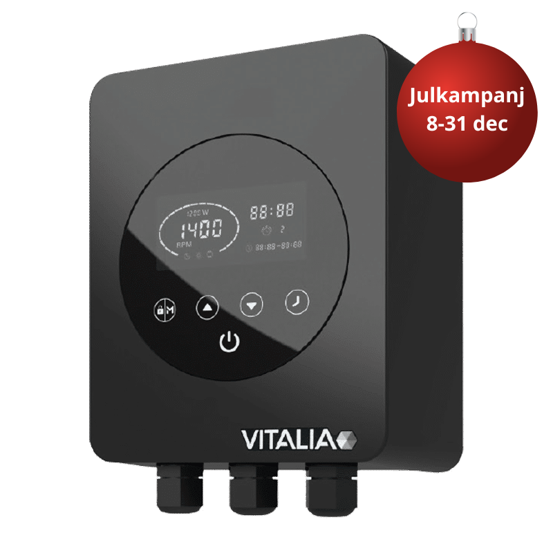 VITALIA VS är en kompakt och kraftfull frekvensomriktare för 1-fas poolpumpar utan inbyggd frekvensstyrning eller timer. Genom att sätta lägre varvtal minskar du pumpens energiförbrukning, får en lägre ljudnivå och bättre filtrering då smuts och bakterier fastnar bättre i filtret vid lägre flödeshastigheter.