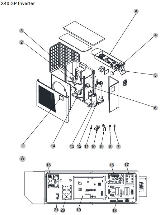 | Reservdelar | 1. Komplett LED V/Q/X/S-serien, Intus, Bonum (svart med knappar) – 7011265 , 5. Spole X40, X40-3P, X60, X60-3P R32 – 7011228, 10. Flödesgivare G&J poolvärmepumpar – 7011211, 13. Värmekabel till bottentråg – 72037, 15. Styrkort PC1004 X40, X40-3P, X60, X60-3P R32 – 7011105 |