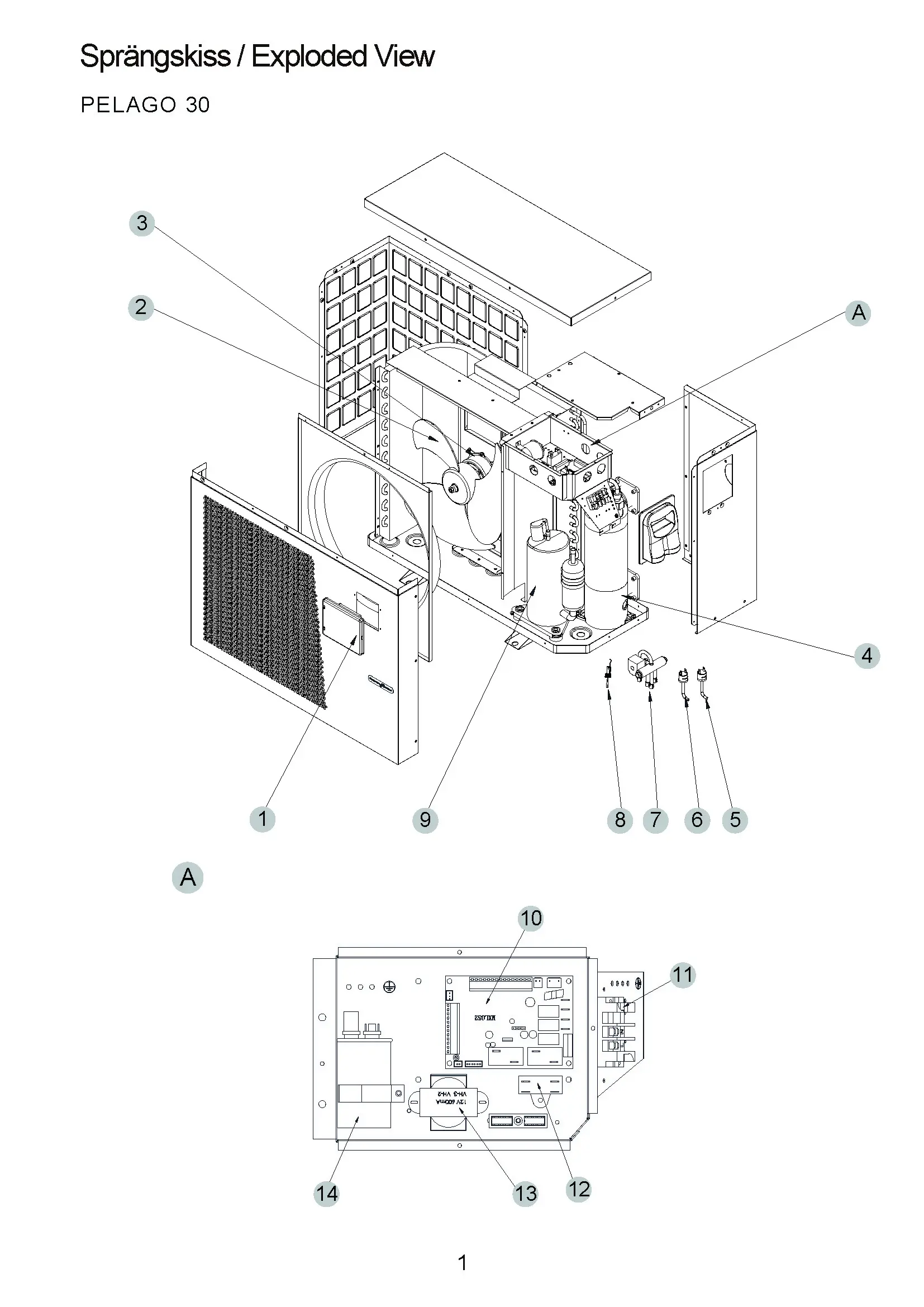 | Reservdelar | 1. Komplett LED P-serien R32 – 7011263, 8. Flödesgivare G&J poolvärmepumpar – 7011211 , 10. PC1001 P-series R32 – 7011264, 12. Kondensator fläktmotor 2µF – 71022, 13. Transformator 12 V 600 mA P10/P15/P20/P30 R32 serien – 71137, 14. Kondensator kompressor 35µF – 71019 |