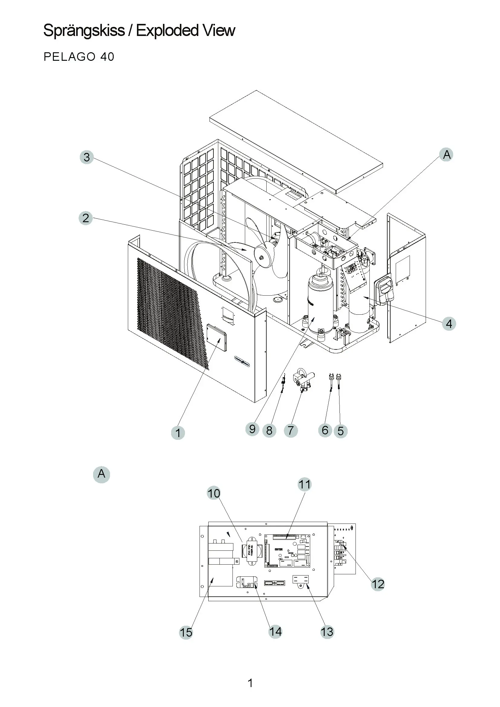 | Reservdelar | 1. Komplett LED P-serien R32 – 7011263 , 8. Flödesgivare G&J poolvärmepumpar – 7011211 , 10. Transformator 12 V 600 mA P10/P15/P20/P30 R32 serien – 71137 , 11. PC1001 P-series R32 – 7011264 , 13. Kondensator fläktmotor 3µF – 71023 |