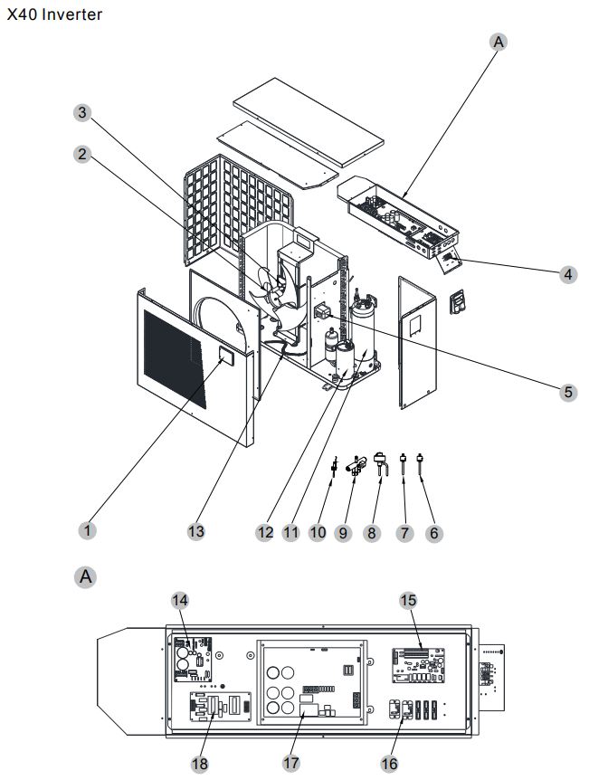 | Reservdelar | 1. Komplett LED V/Q/X/S-serien, Intus, Bonum (svart med knappar) – 7011265 , 5. Spole X40, X40-3P, X60, X60-3P R32 – 7011228, 10. Flödesgivare G&J poolvärmepumpar – 7011211, 13. Värmekabel till bottentråg – 72037, 15. Styrkort PC1004 X40, X40-3P, X60, X60-3P R32 – 7011105 |