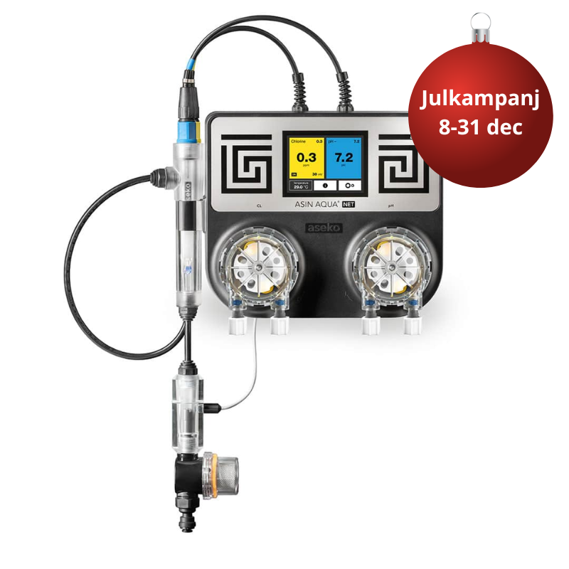 ASIN AQUA Net är ett kompakt doserings-och kontrollsystem från ASEKO som både mäter vattenkvaliteten i poolen och doserar rätt mängd kemikalier iform av flytande klor och flytande pH-minus.