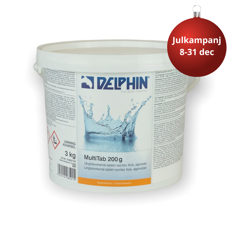 DELPHIN MultiTab 200g är enkel att dosera. Placera tabletten i bräddavloppet eller i en doseringsflottör. Tillsätt aldrig MultiTab 200g direkt i poolen eftersom risken för blekning är stor. Det gäller speciellt för pooler med liner. Kontrollera klor värdet var tredje dag och justera genomströmningen i bräddavloppet eller justera den flytande klorfördelaren. Det rekommenderade värdet är 1-1,5 ppm (mg/l). Poolvattnet ska chockkloreras var 2-4 vecka, beroende på hur mycket poolen används och väderförhållandet.