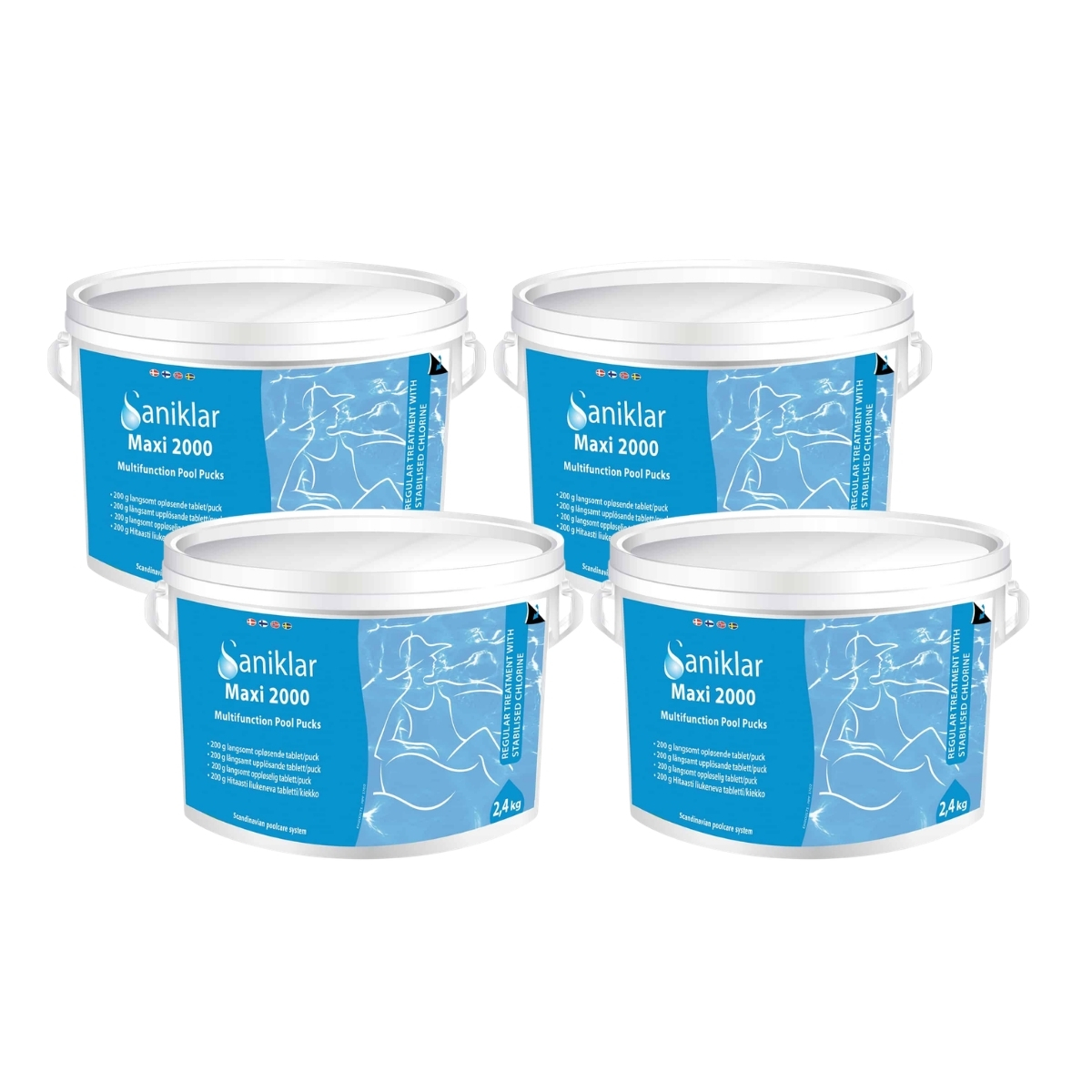 Saniklar Maxi 2000 är en långsamt löslig 200 grams klortablett, som under en vecka avger en underhållsdos av klor, flocknings- och algmedel.
