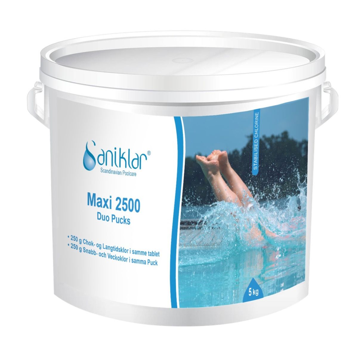 Saniklar Maxi 2500 Duo Pucks är en modern flerkomponentstablett som består av en del som långsamt löses (vit) och en del som snabbt löses i vatten (blå). Bägge delarna baseras på organiskt klor.