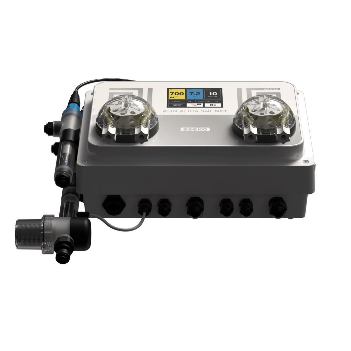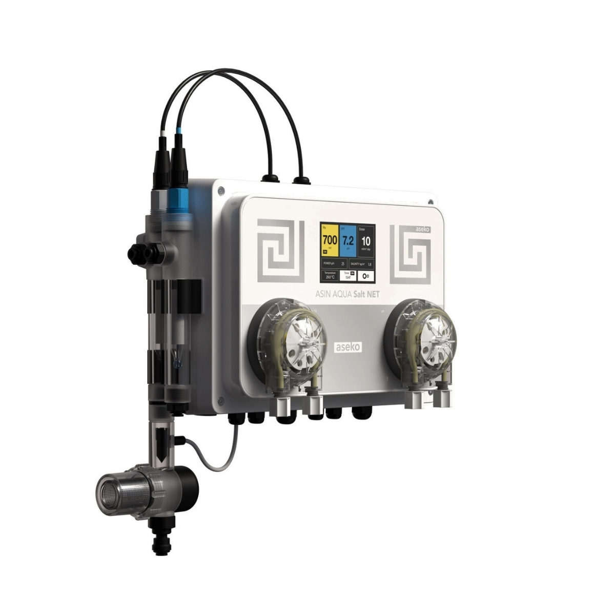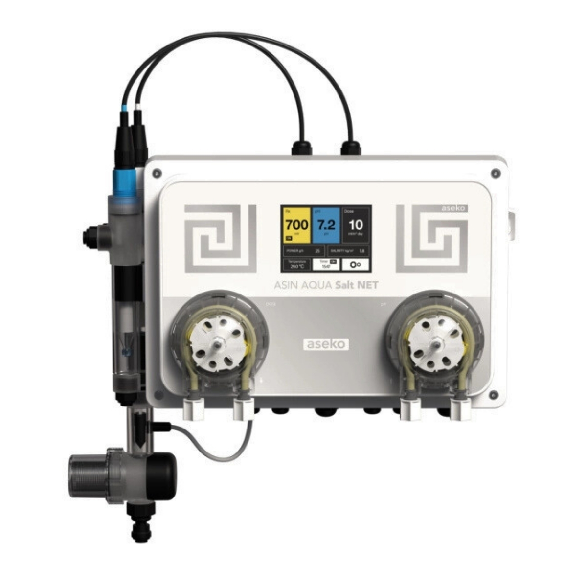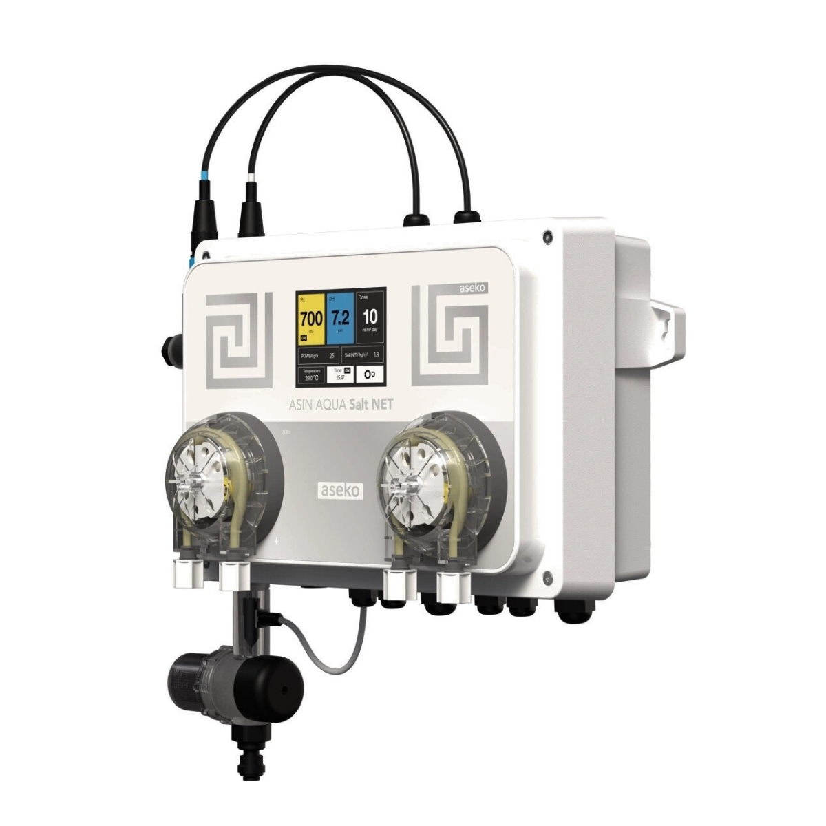 Den användarvänliga displayen och uppkopplingen via ASIN Aqua Net gör det enkelt att övervaka och styra poolens vattenkvalitet, både lokalt och på distans.