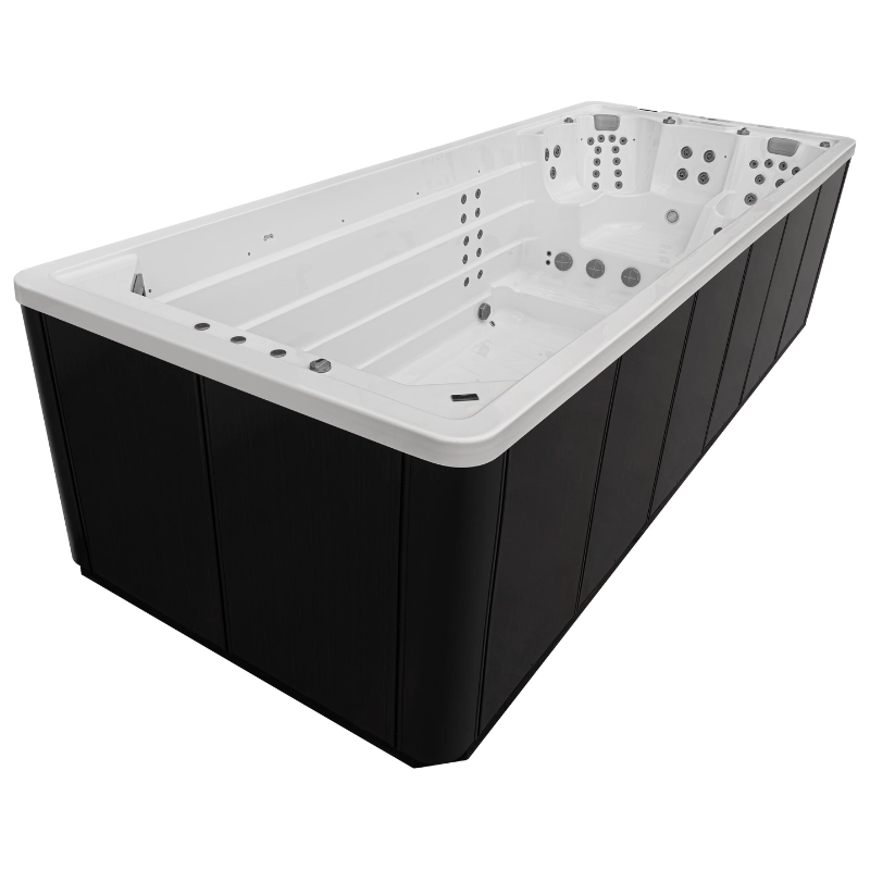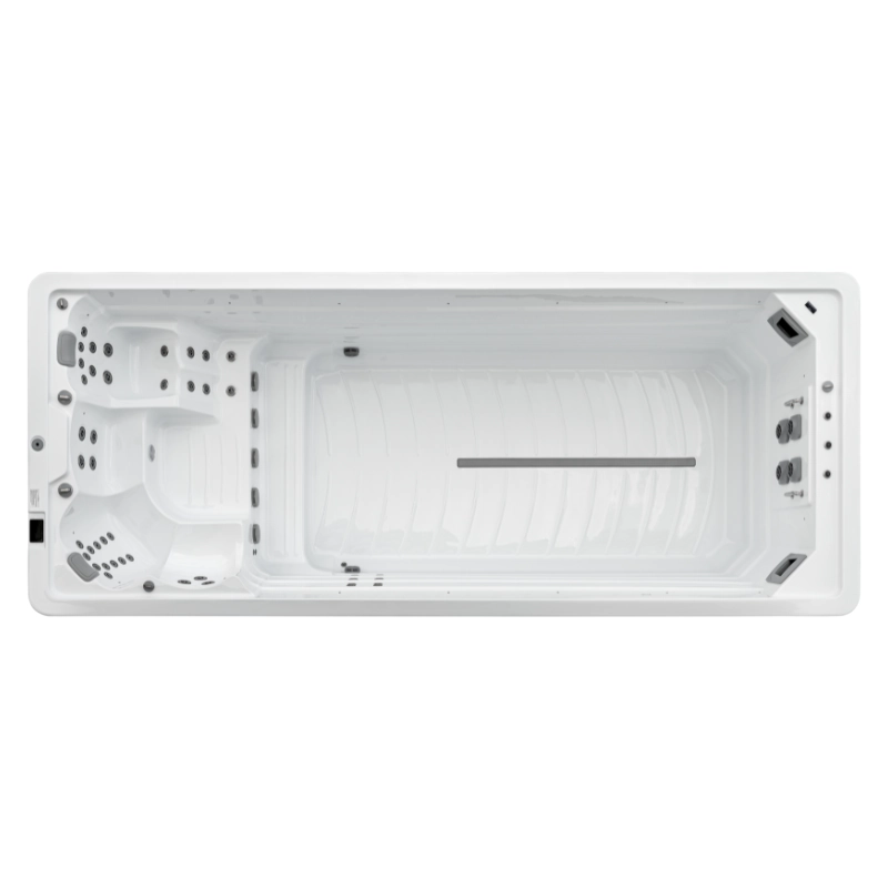 Simdelen är utrustad med ett kraftfullt motströmssystem med fyra munstycken och tre starka jetpumpar som ger en jämn och stabil motström, perfekt för kontinuerlig simträning. De fyra sittplatserna gör badet lika lämpat för återhämtning och familjetid efter träningen.