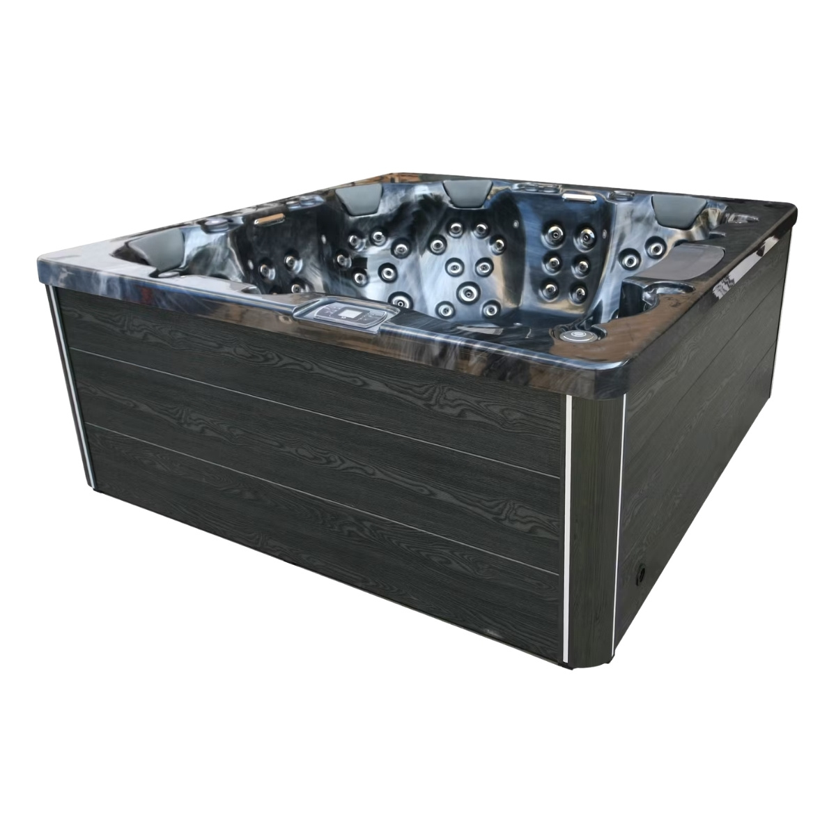 Stämningen förstärks av integrerad LED-undervattensbelysning och två vattenfall som skapar en rogivande atmosfär. Spabadet är tillverkat i exklusiv Lucite-akryl i färgen Pearl Shadow, kombinerat med en stilren ytterpanel i Black Oak som ger ett modernt och tidlöst uttryck. Fyra nackkuddar och ett extra tjockt termolock ingår för maximal komfort och energieffektivitet.