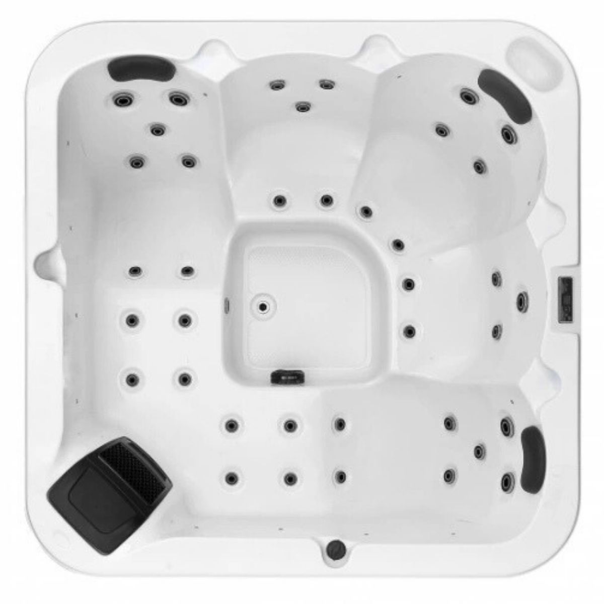 Badet är utrustat med två ergonomiska liggplatser och tre sittplatser, vilket skapar en flexibel och social badmiljö. De 38 strategiskt placerade massagejetsen ger en behaglig och effektiv massage för rygg och axlar, perfekt för både vardagsavkoppling och längre badstunder.
