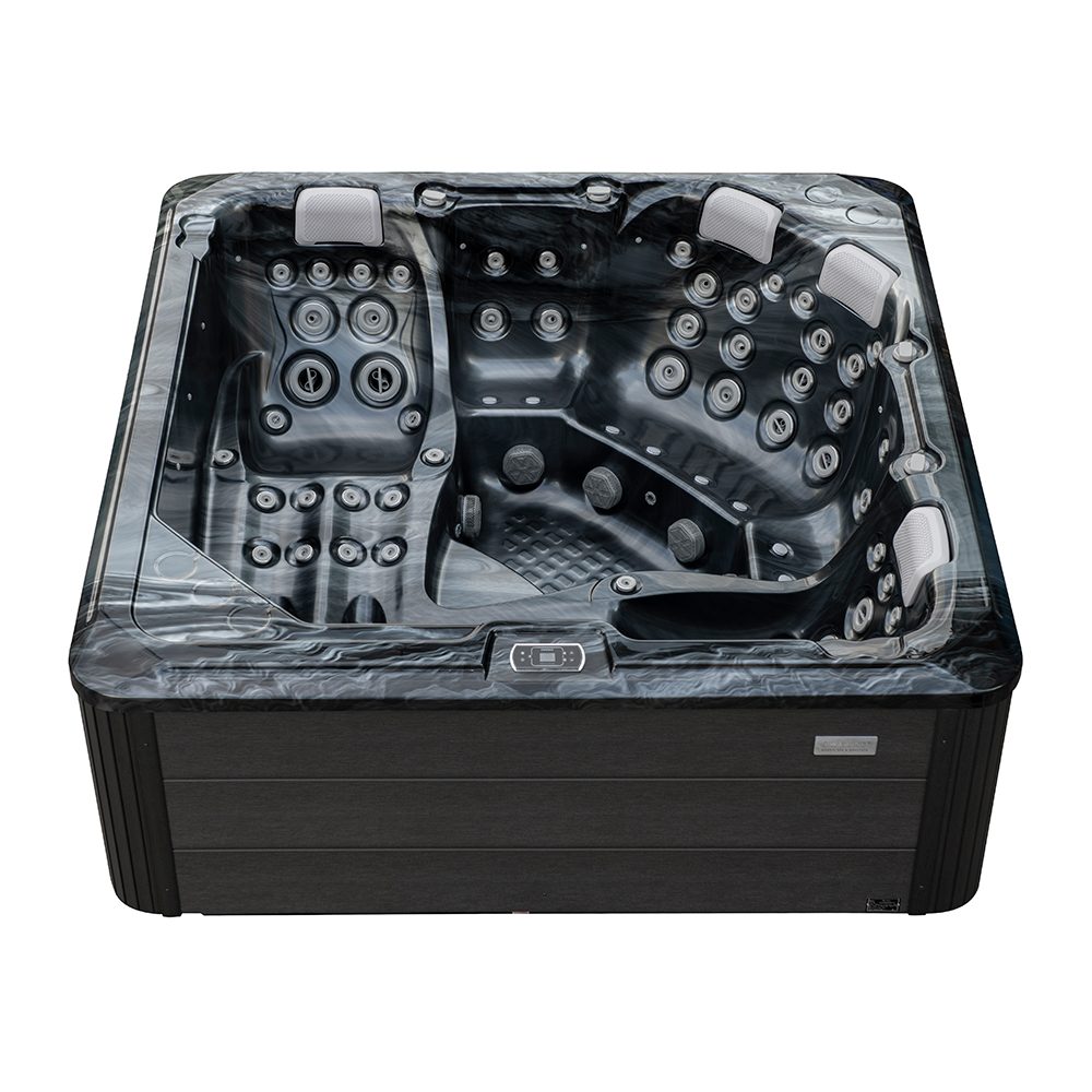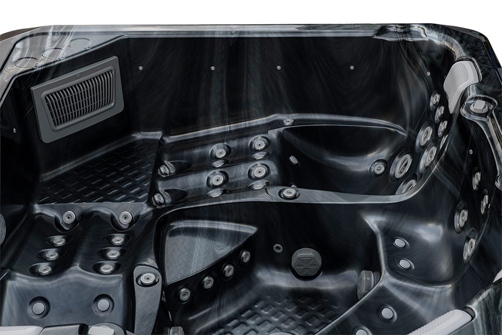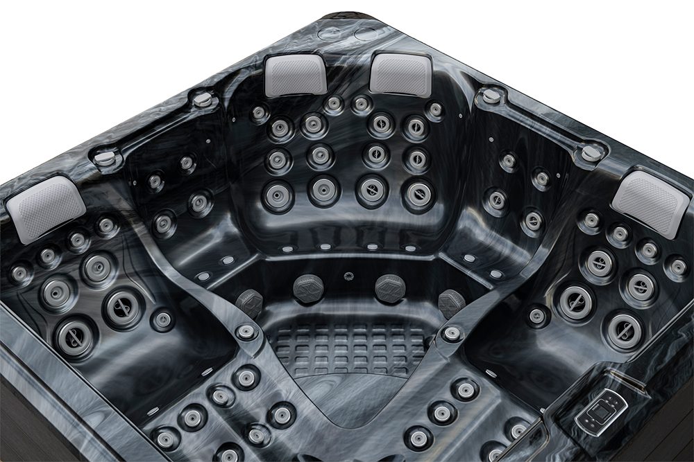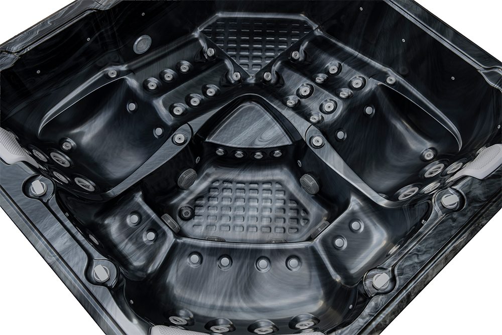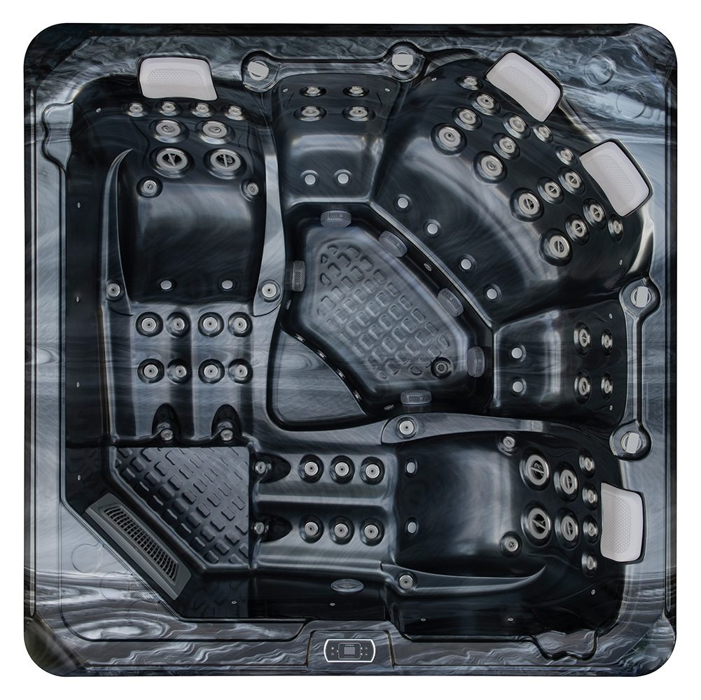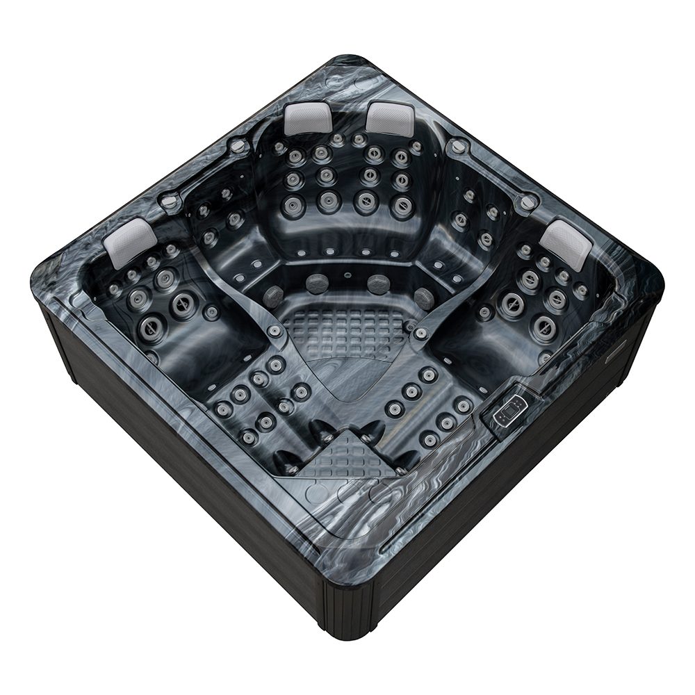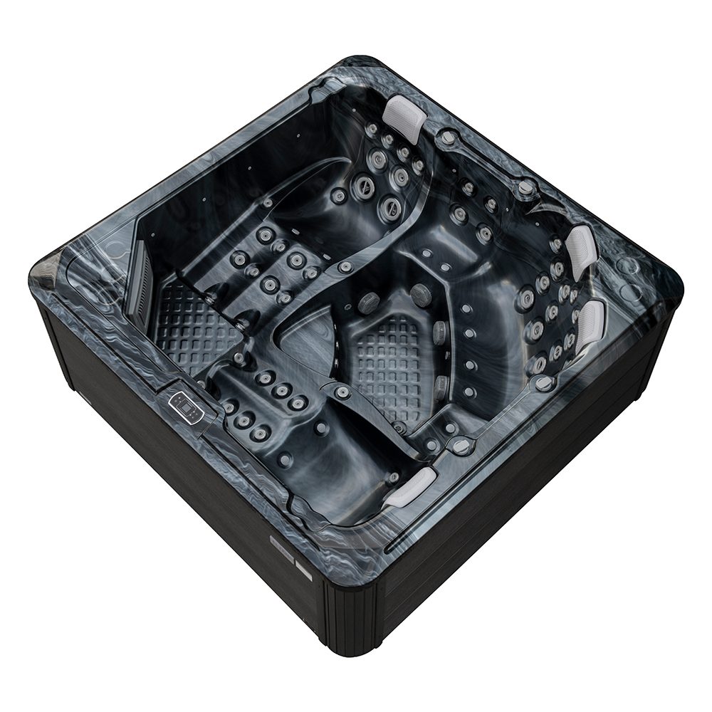 Spabad Galaxy Pearl Shadow är ett rymligt spabad på 2,3 × 2,3 meter med plats för sex personer, fyra sittplatser och två generösa ligglounger.