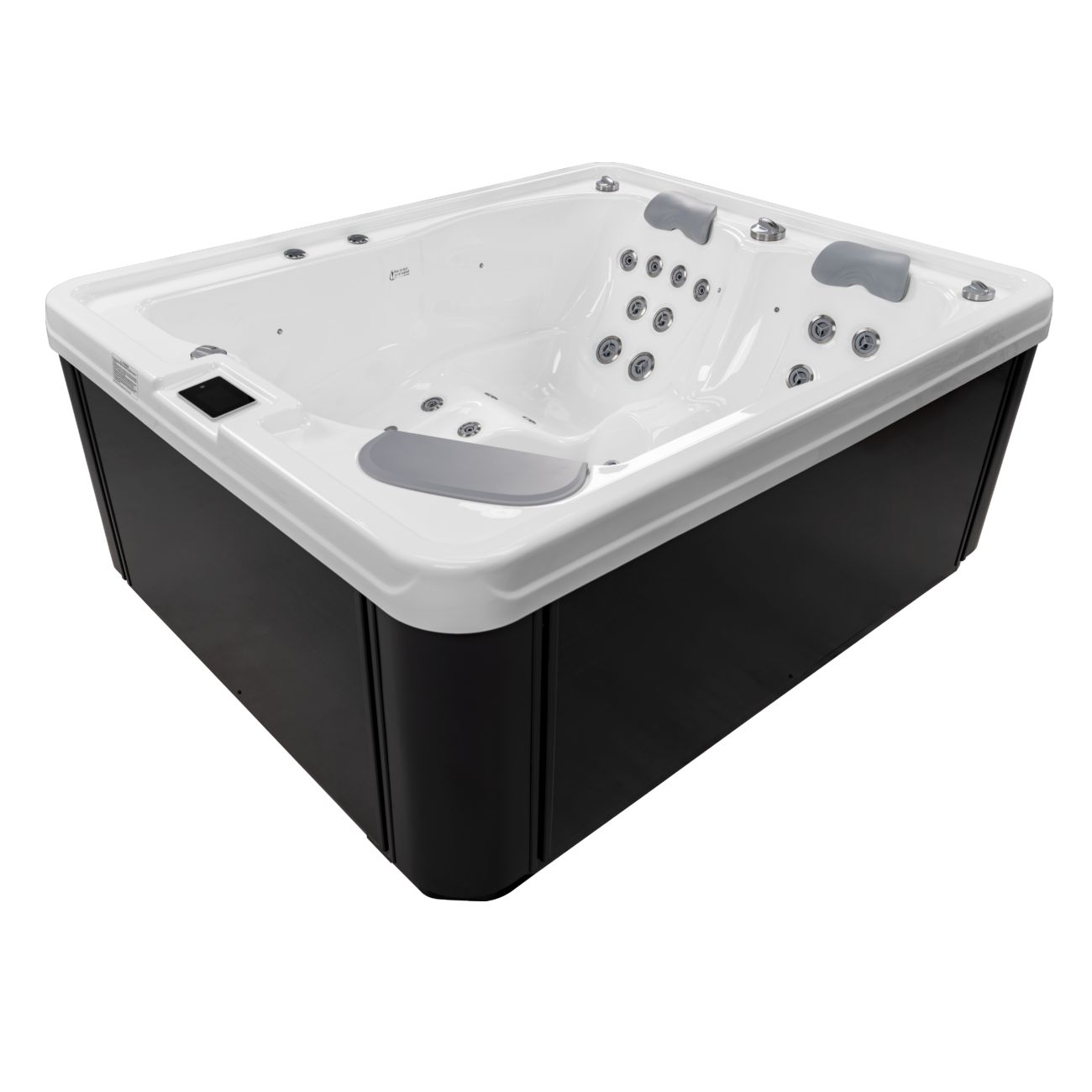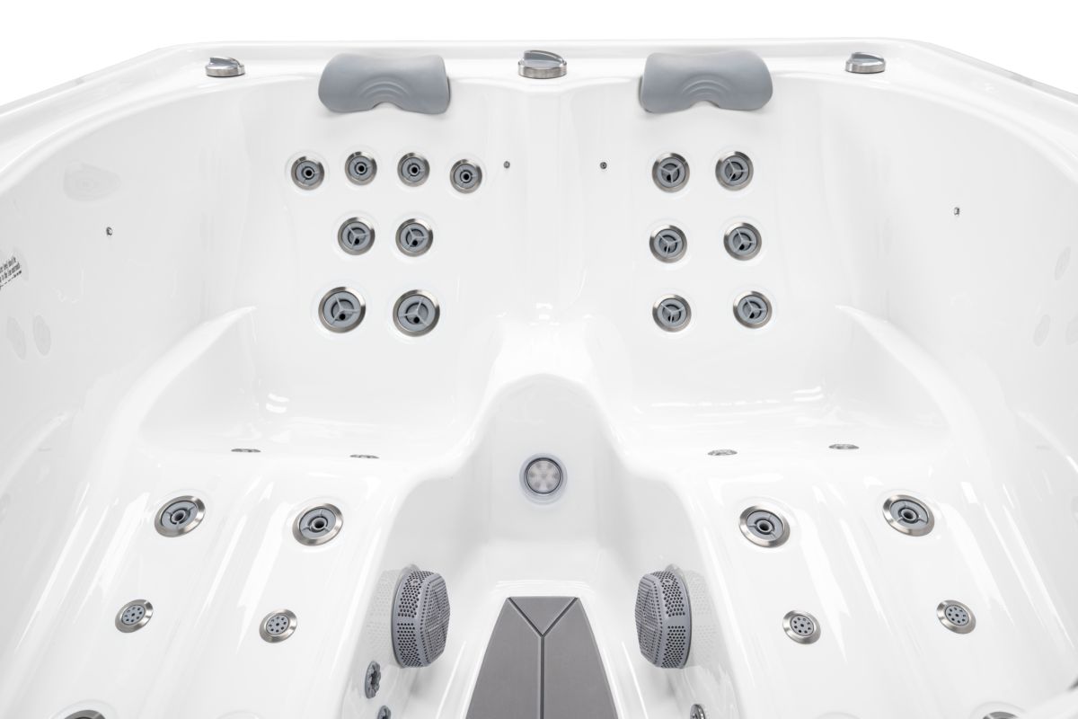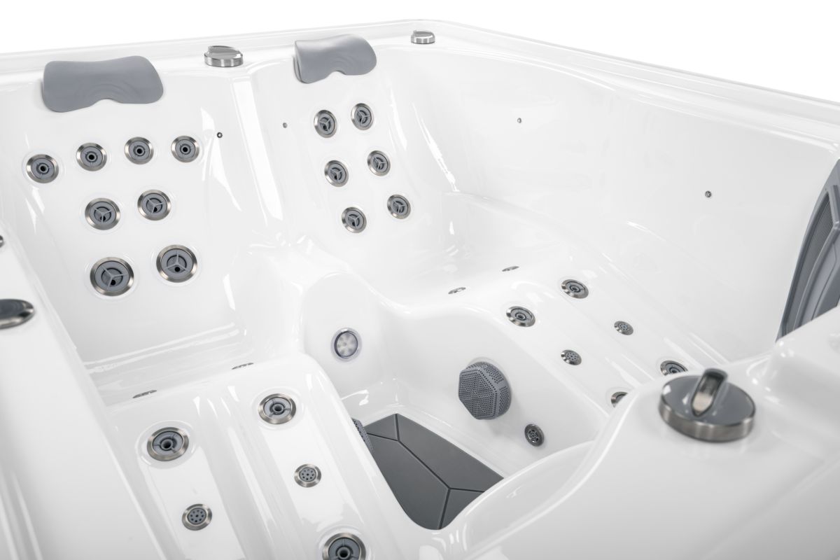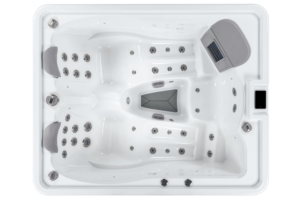 Spabad Isla är ett kompakt och lyxigt spabad på 2 × 1,64 meter med plats för tre personer, två ligglounger och ett sittläge.