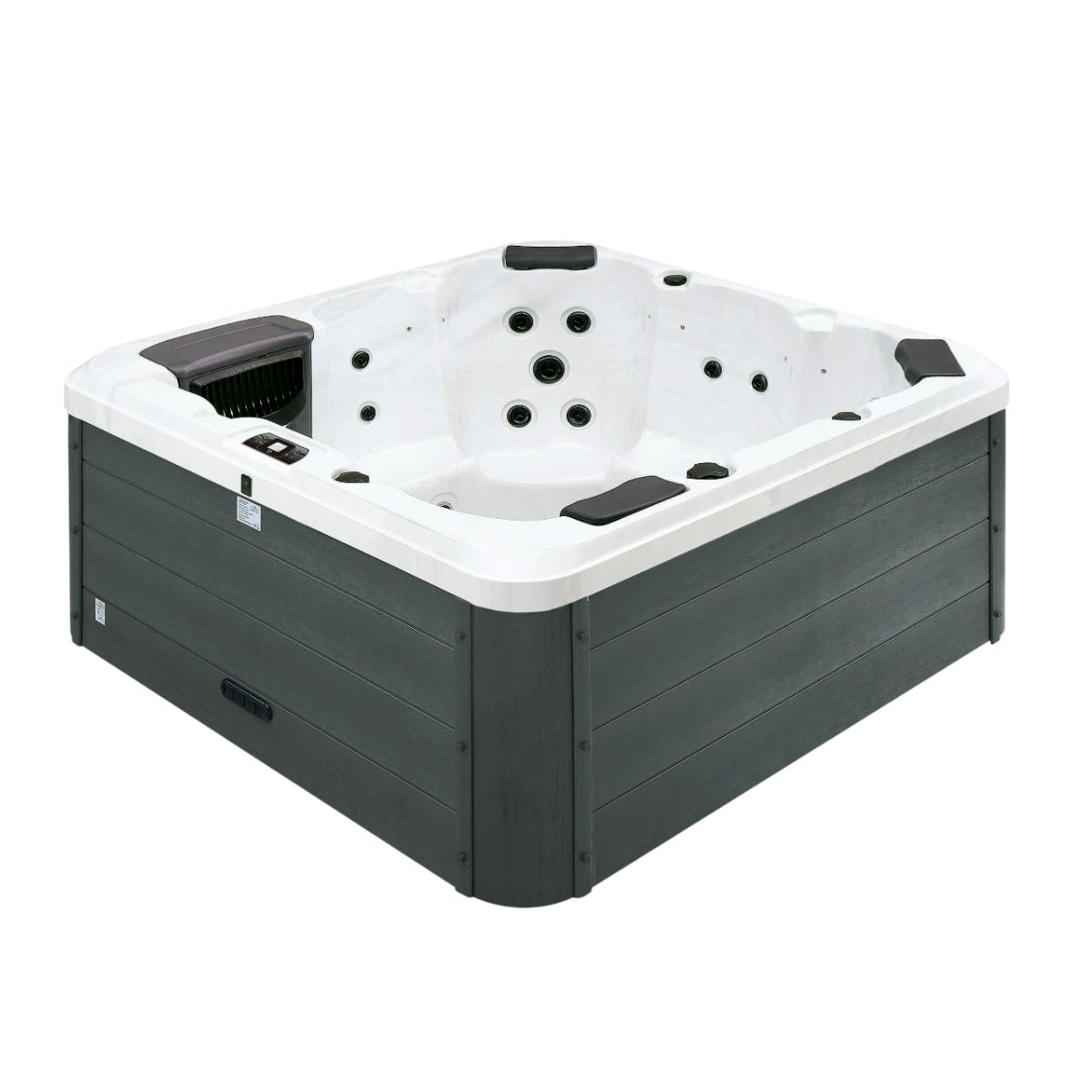 Spabadet är tillverkat i slitstark Lucite-akryl och har en stilren ytterpanel i Ash Grey. Tre nackkuddar ger extra komfort. Både isolerat spalock och trappa ingår.