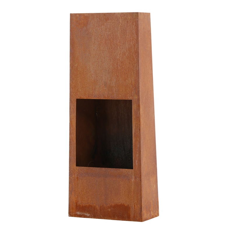 Eldstaden har en modern och minimalistisk form med en kvadratisk öppning som ger en vacker vy över lågorna. Den robusta konstruktionen i stål gör den stabil och hållbar samtidigt som den rostiga ytfinishen ger en unik karaktär som bara blir snyggare med tiden.