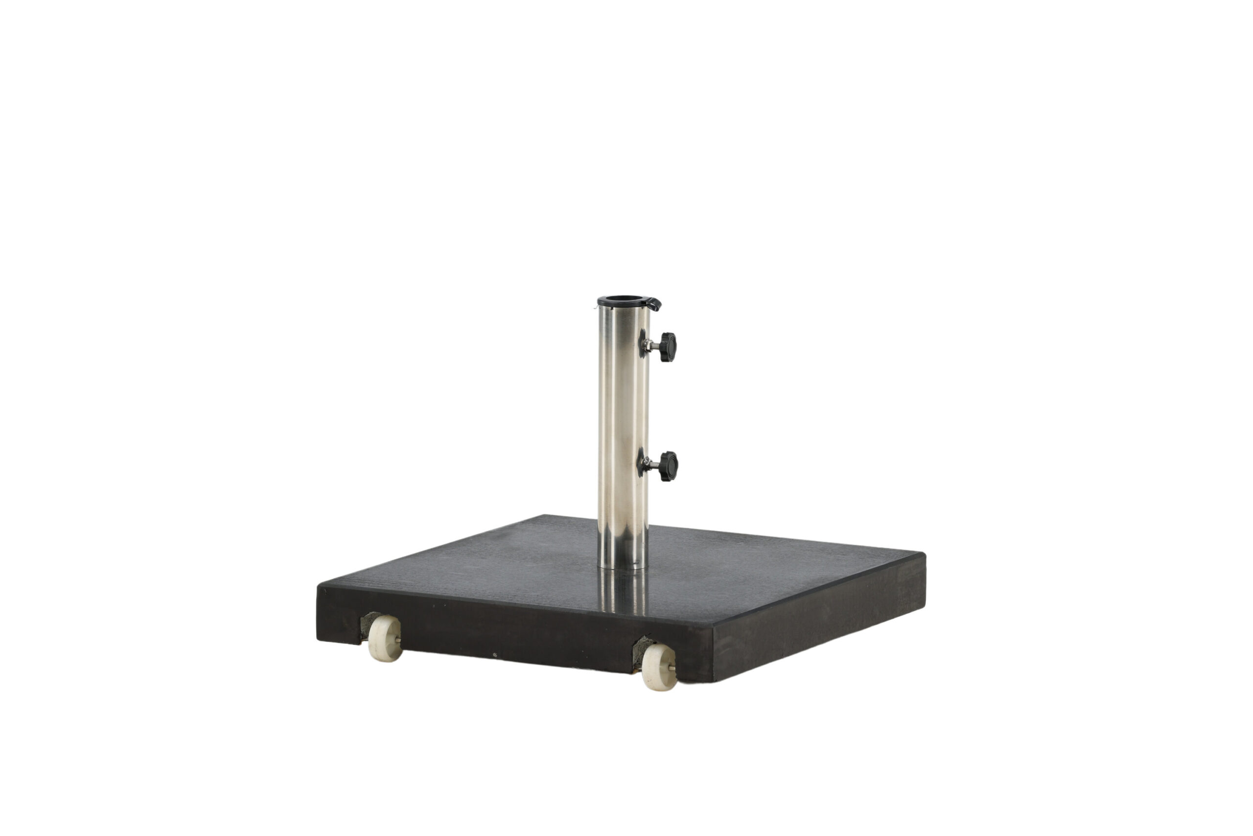 Enkel och stilren parasollsten i svart. Robust konstruktion med två hjul och handtag. Vikt 40kg.