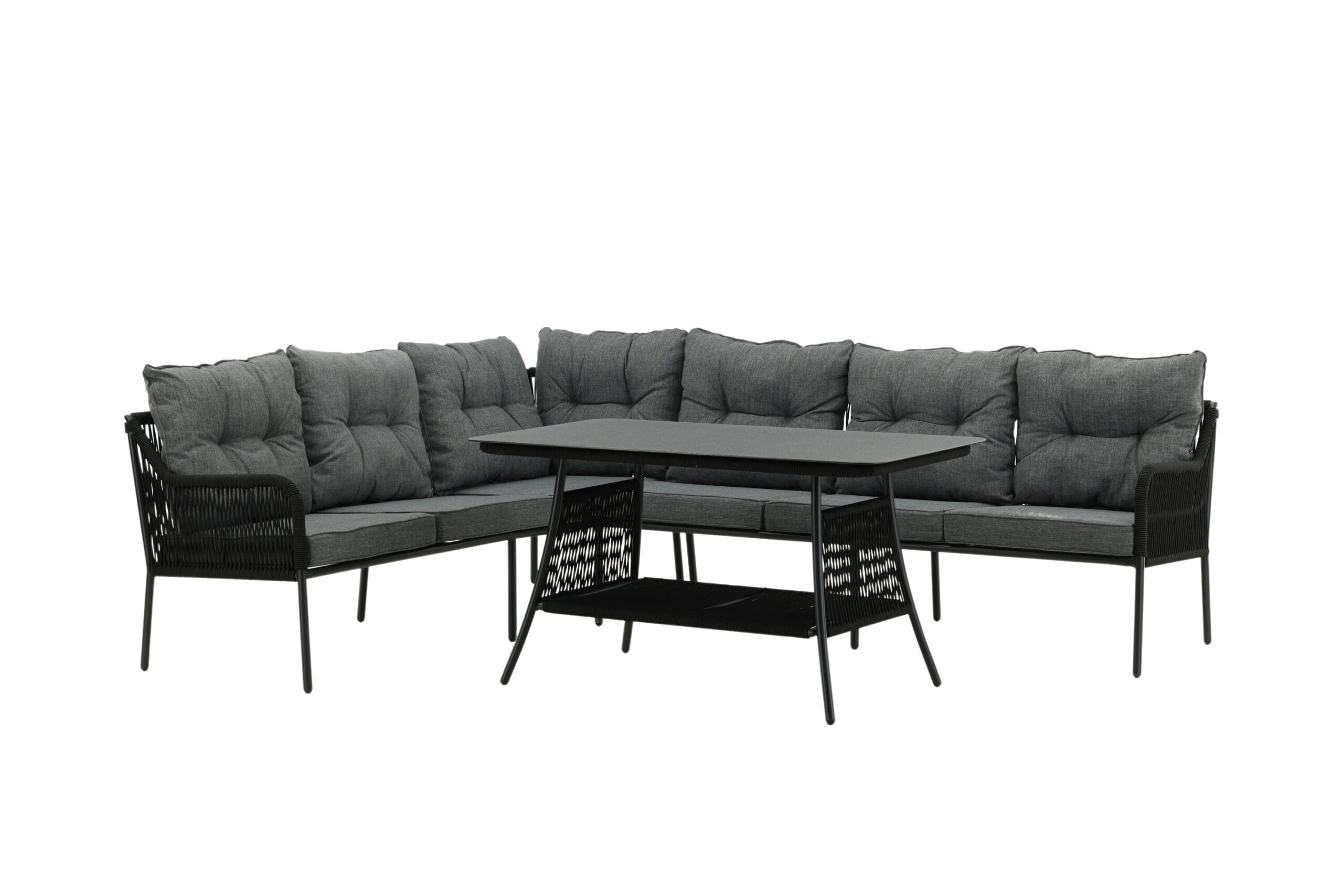 Skapa en inbjudande oas på din uteplats i sommar! Berlin soffgrupp är en skön och snygg grupp i svart stål och flätat rep med tillhörande, matchande soffbord som har en stilren toppskiva i glas. Slitstarka dynor i grått ingår och gruppen rymmer totalt 6 sittande gäster. Bordets mått: 120x70x66 cm. Soffans mått: 193/173×63,5×69,5 cm. Sittmått: 178/169x52x32 cm. Enklare montering krävs. Här kan du och dina gäster bekvämt avnjuta sena sommarkvällar!