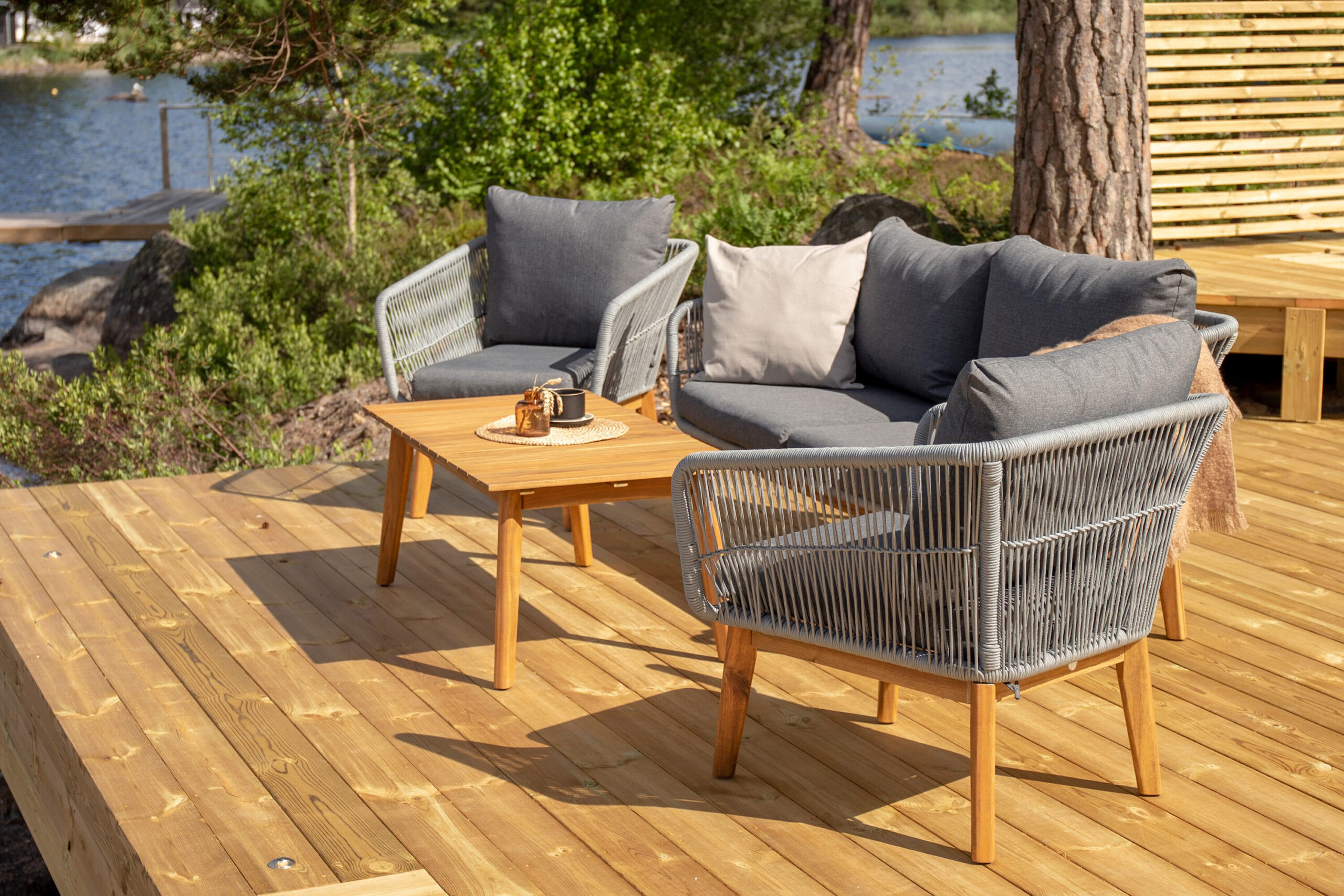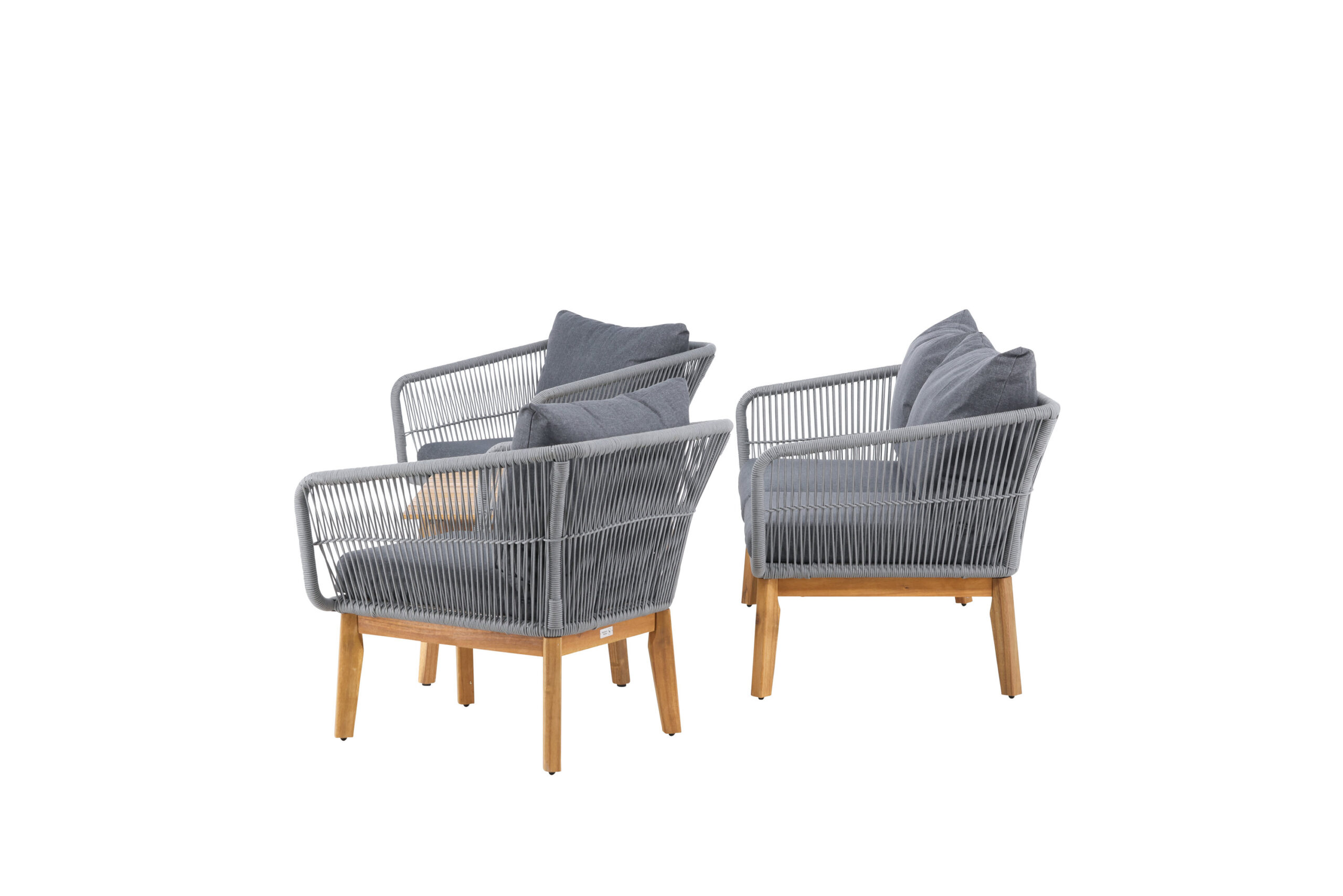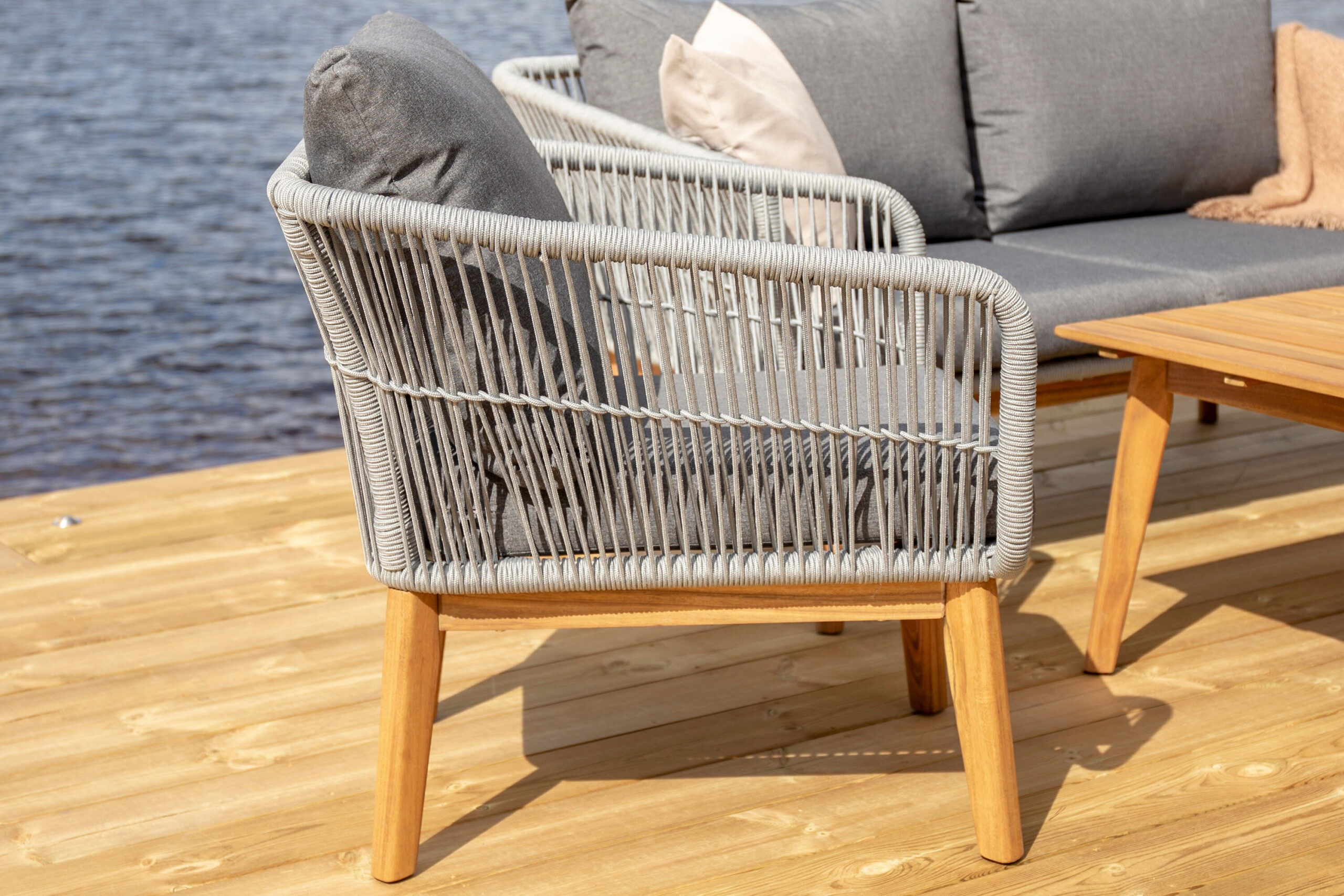 Chania – en trendig soffgrupp med fokus på bekvämlighet och iögonfallande design. Soffgruppen består av en tvåsits soffa, två karmfåtöljer inklusive tjocka slitstarka mörkgrå dynor. Till soffan ingår även ett lågt soffbord tillverkat helt i vacker acacia. Soffgruppen är tillverkad med en stomme i aluminium och ben i acacia samt är rygg och sidor flätade i ett ljusgrått rep som ger en stilren design. Soffgruppens detaljer i acacia tillsammans med soffbordet klassiska utformning skapar en exklusiv helhetskänsla.