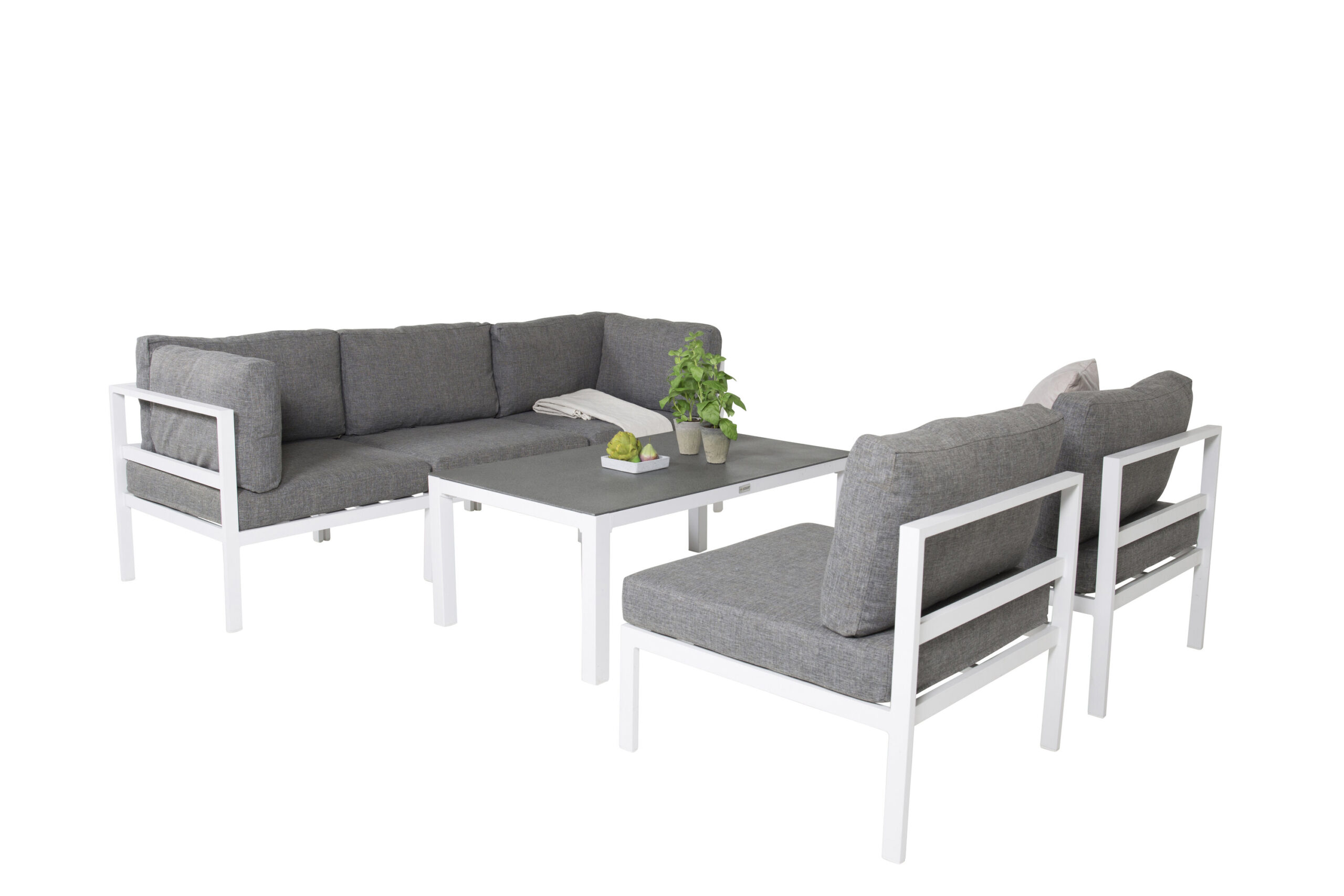 Med moduler kan du bygga ihop din egen soffgrupp efter tycke och smak. Den här bekväma hörndelen med grå kuddar tillhör serien Copacabana – skapa plats för en gäst till! Här i kombination med matchande soffbord i samma serie – lika stilrent som praktiskt! Den minimalistiska designen och raka nordiska formerna skapar ett modernt blickfång på din uteplats eller altan i sommar. Tillverkad i vit pulverlackerad metall med en bordsskiva i grå sprayglas.