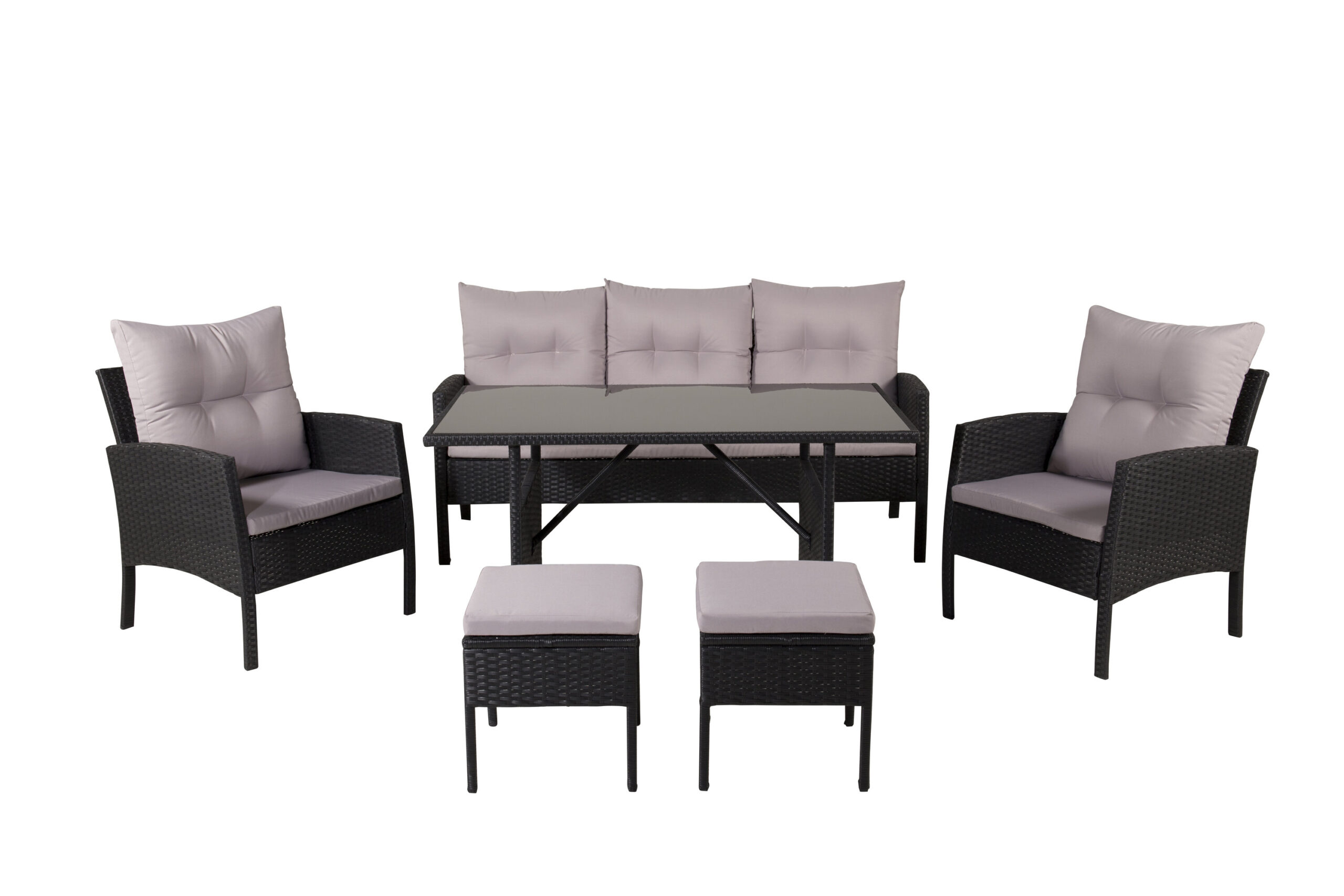 Knock skapar ett inbjudande blickfång till din uteplats! En modern mångsidig soffgrupp i svart konstrotting som passar utmärkt både till altanen eller uterummet. Soffgruppen består av en tresits soffa, två karmfåtöljer samt två pallar, inklusive gråa pickerade mjuka dynor samt ett rektangulärt matbord med en bordsskiva av svart glas. Lättare montering krävs. Tips: pallarna kan användas som extra sittplats eller som fotpall till fåtöljerna eller soffan.