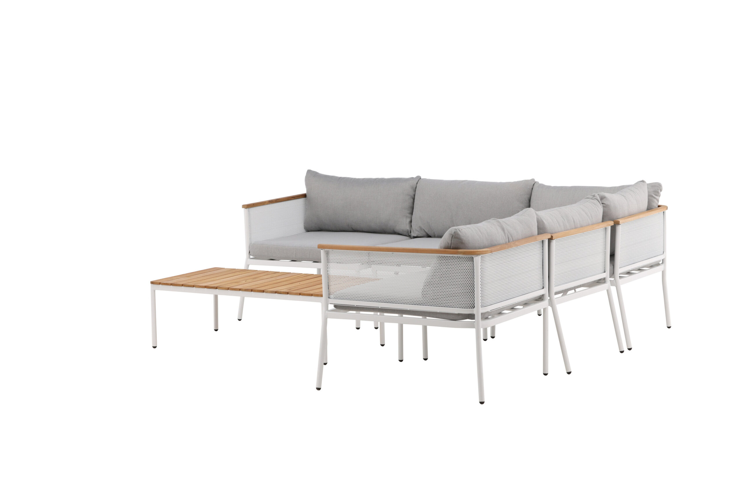 Nettan – den perfekta soffgruppen i modern och stilren design till din uteplats eller altan! Soffgruppen består av en hörnsoffa som är modulbaserad, så det går att placera den på flera olika sätt precis som du vill ha den med 3 sittplatser och en hörndel. Tillverkad i vit pulverlackerad metall och detaljer i vit metallnät och teak inklusive mjuka grå dynor samt ett rektangulärt soffbord med en bordsskiva i teak. Lättare montering krävs. Här slår du dig gärna ner tillsammans med nära och kära under sena sommarkvällar!