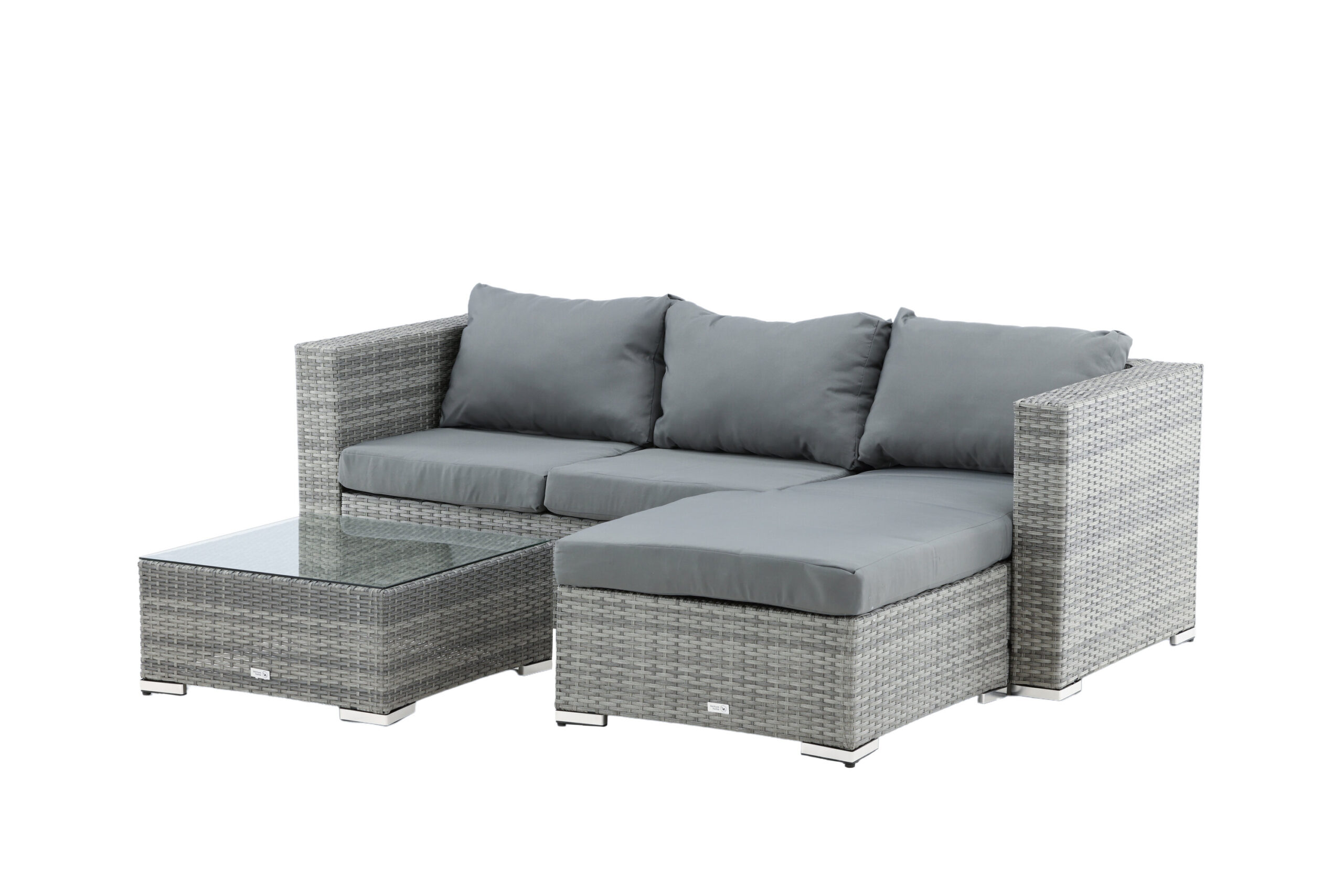 Rotterdam loungeset imponerar med sin lyxiga, avkopplade design och raka nordiska former. Tillverkat i slitstark grå rotting och stål med tillhörande matchande bord med en toppskiva i glas. Bekväma dynor i grått ingår och gruppen rymmer totalt 3 sittande gäster. Bordets mått: 65x65x30 cm. Soffans mått: 202x78x64 cm. Sittmått: 176x65x30 cm. Här kan du och dina gäster sitta rofyllt i timmar!