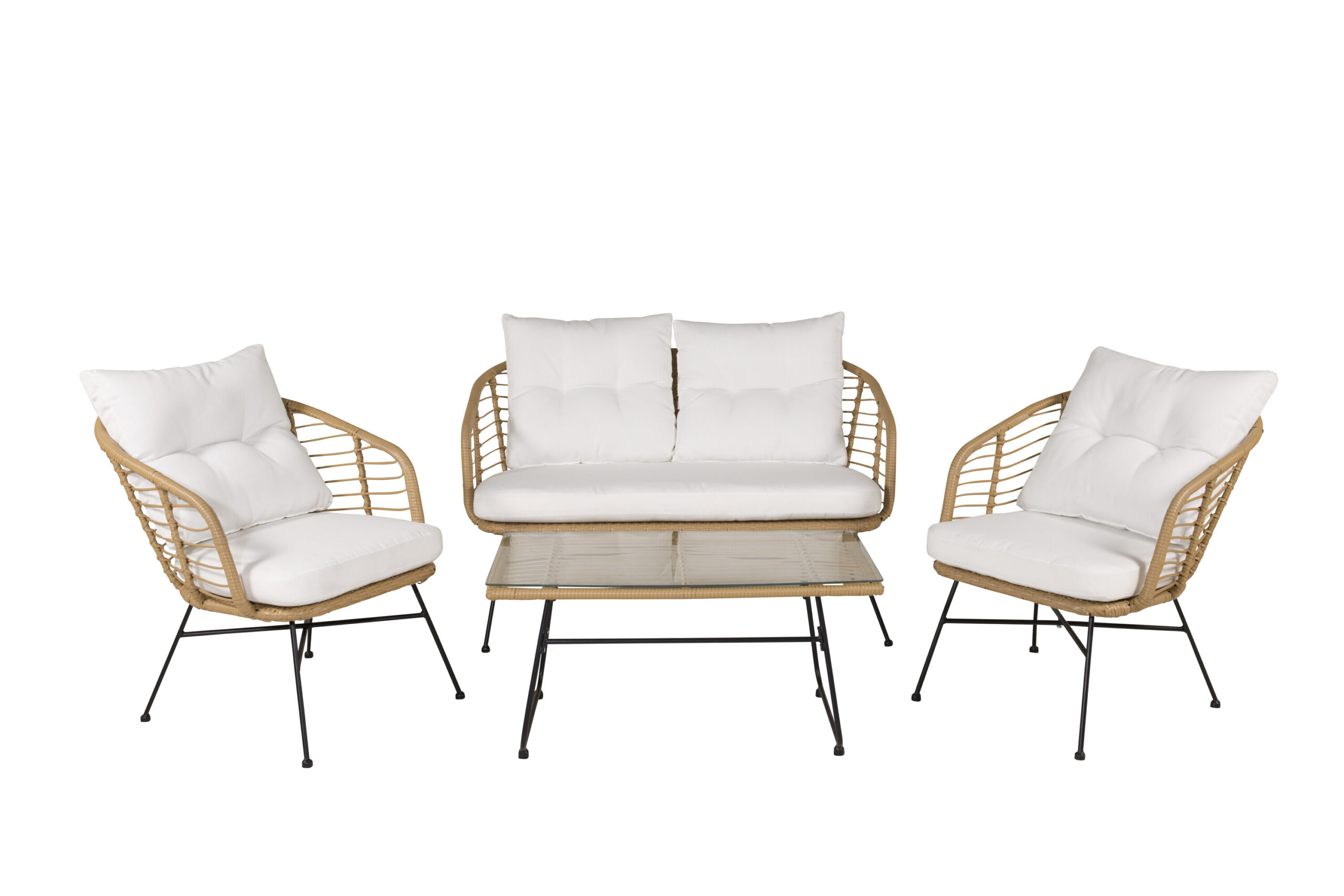 Stilren nätt soffgrupp i modern design som passar perfekt på den inglasade uteplatsen. Möbelgruppen består av en tvåsitssoffa, två karmfåtöljer tillverkat i en nätt ramställning i svart pulverlackerad metall samt rygg och sits är designat i ett stilrent nätt mönster av naturrotting. Inklusive vita dynor och ett soffbord med detaljer i wicker och en bordsskiva av glas. Inred uteplatsen med en lounge-grupp som garanterat kommer förlänga de sena sommarkvällarna tillsammans med nära och kära!