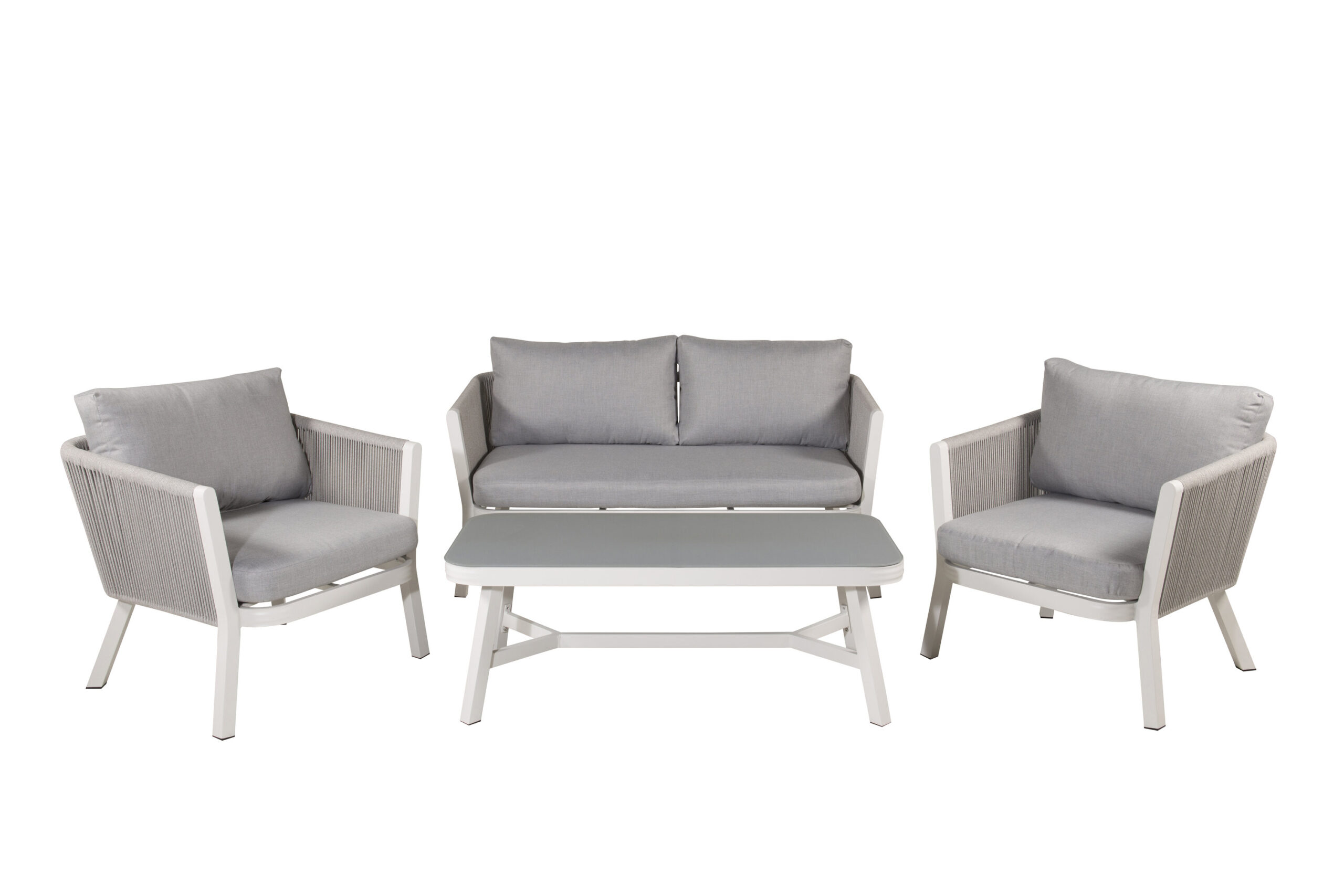 Virya Lounge set är en skön och snygg grupp i vit aluminium med tillhörande bord med en toppskiva i glas. Slitstarka dynor i grått ingår och gruppen rymmer totalt 4 sittande gäster. Bordets mått: 120x55x45,5 cm. Soffans mått: 77×72 cm. Sittmått: 60/133x65x34 cm. Enklare montering krävs.