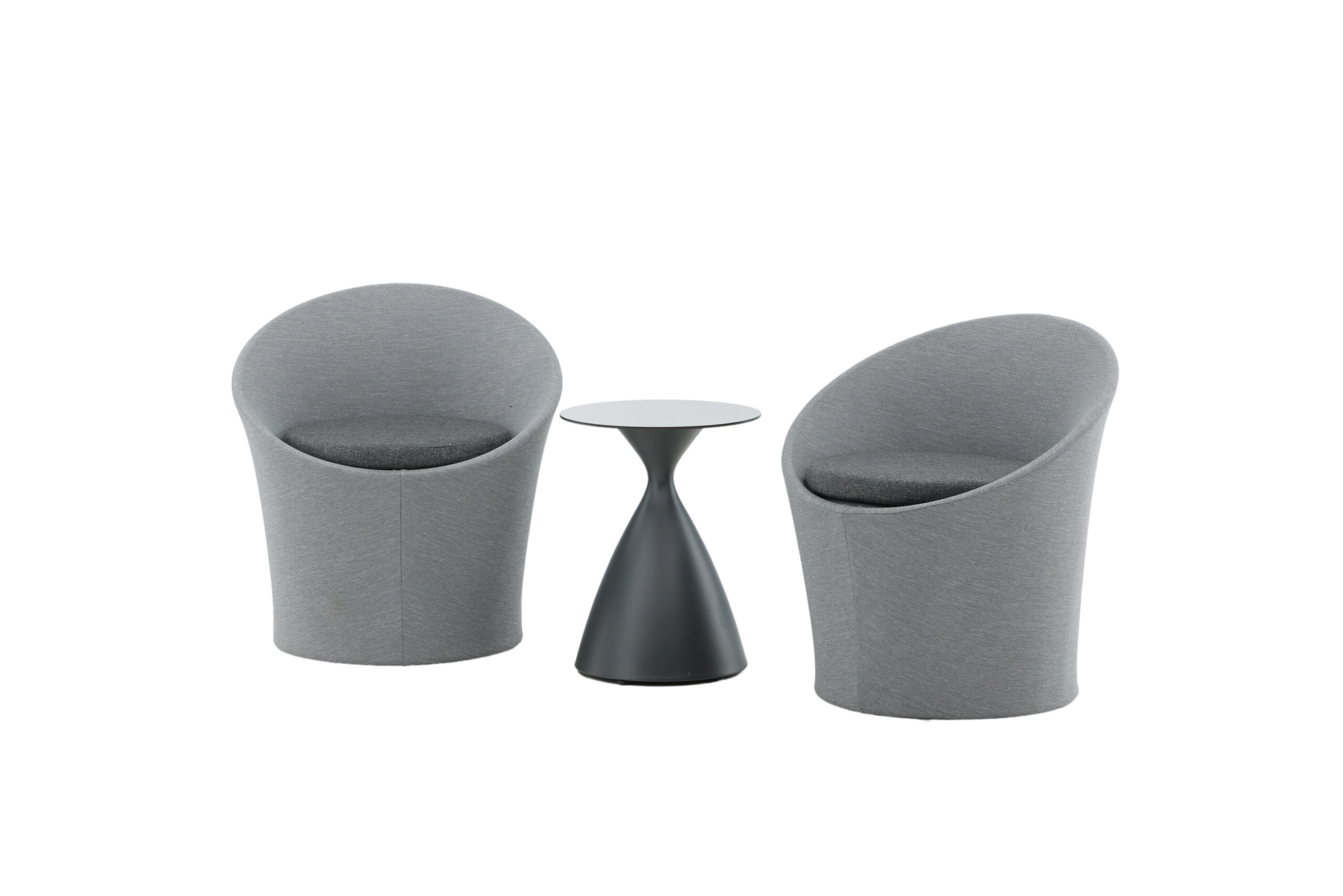 Sätt en personlig prägel på möbleringen i sommar med ett mysigt loungeset från serien Spoga i modern design. De runda formerna skapar en inbjudande och bekväm look, stolarna har en läcker grå kulör, tillverkade av tyg, och det matchande nätta bordet är i svart aluminium. Njut av trevliga fikastunder på uteplatsen!