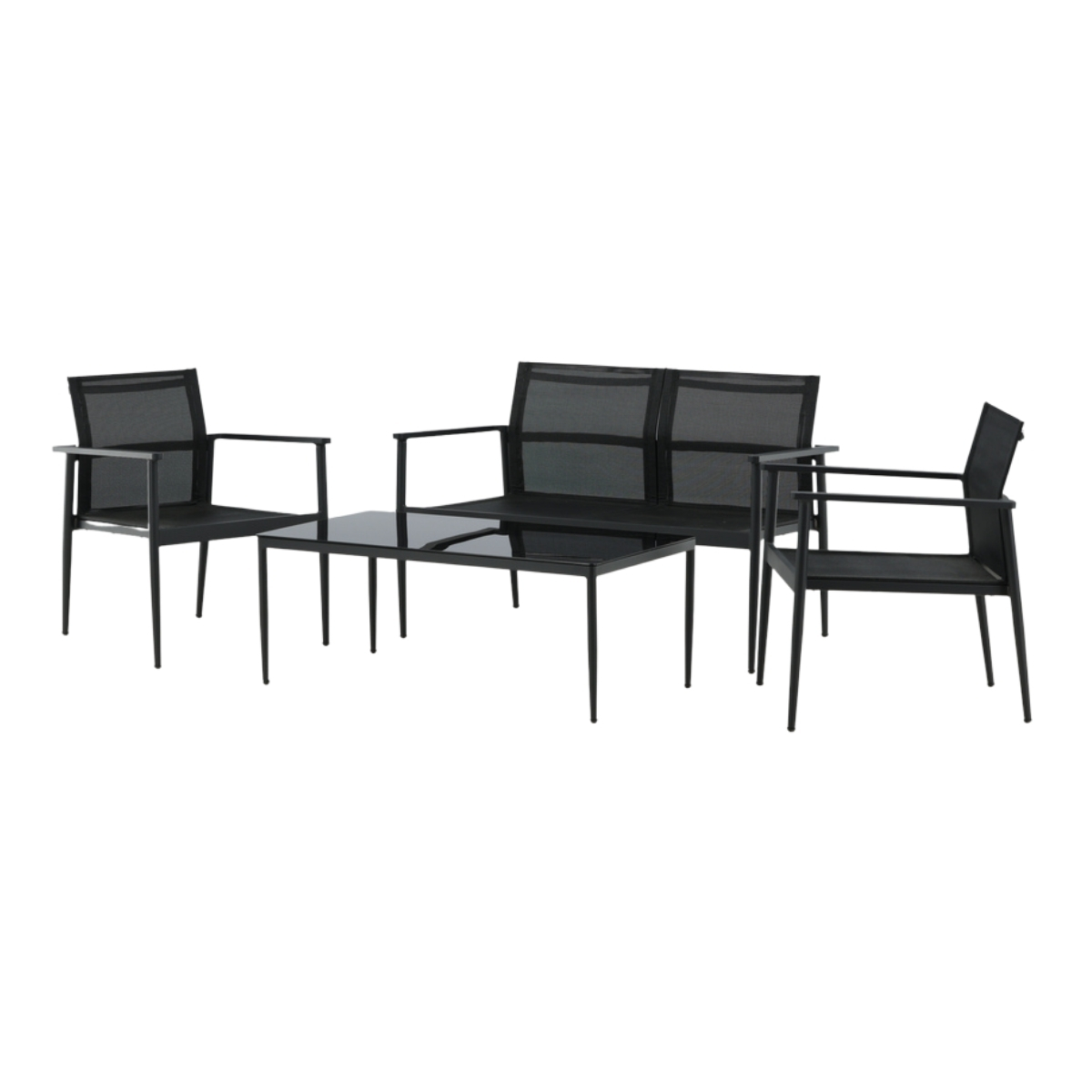 Den luftiga designen med raka linjer ger ett modernt intryck, medan den svarta färgen gör att soffgruppen enkelt matchar olika miljöer och inredningsstilar. Stommen är tillverkad i aluminium – ett material som är både rostbeständigt, lätt och hållbart, vilket gör dessa utemöbler idealiska för nordiskt klimat.