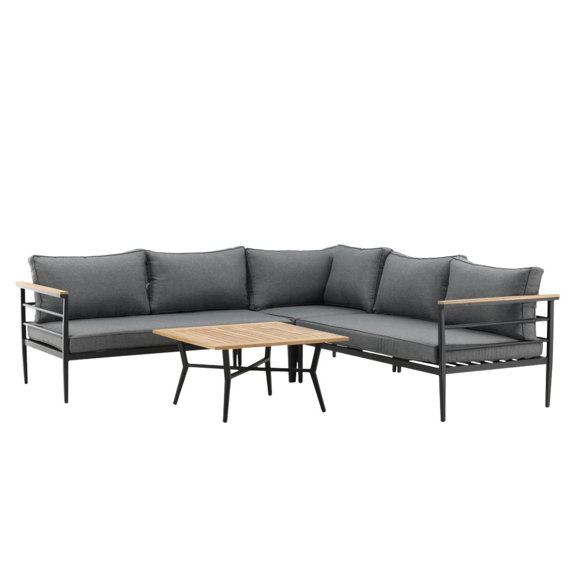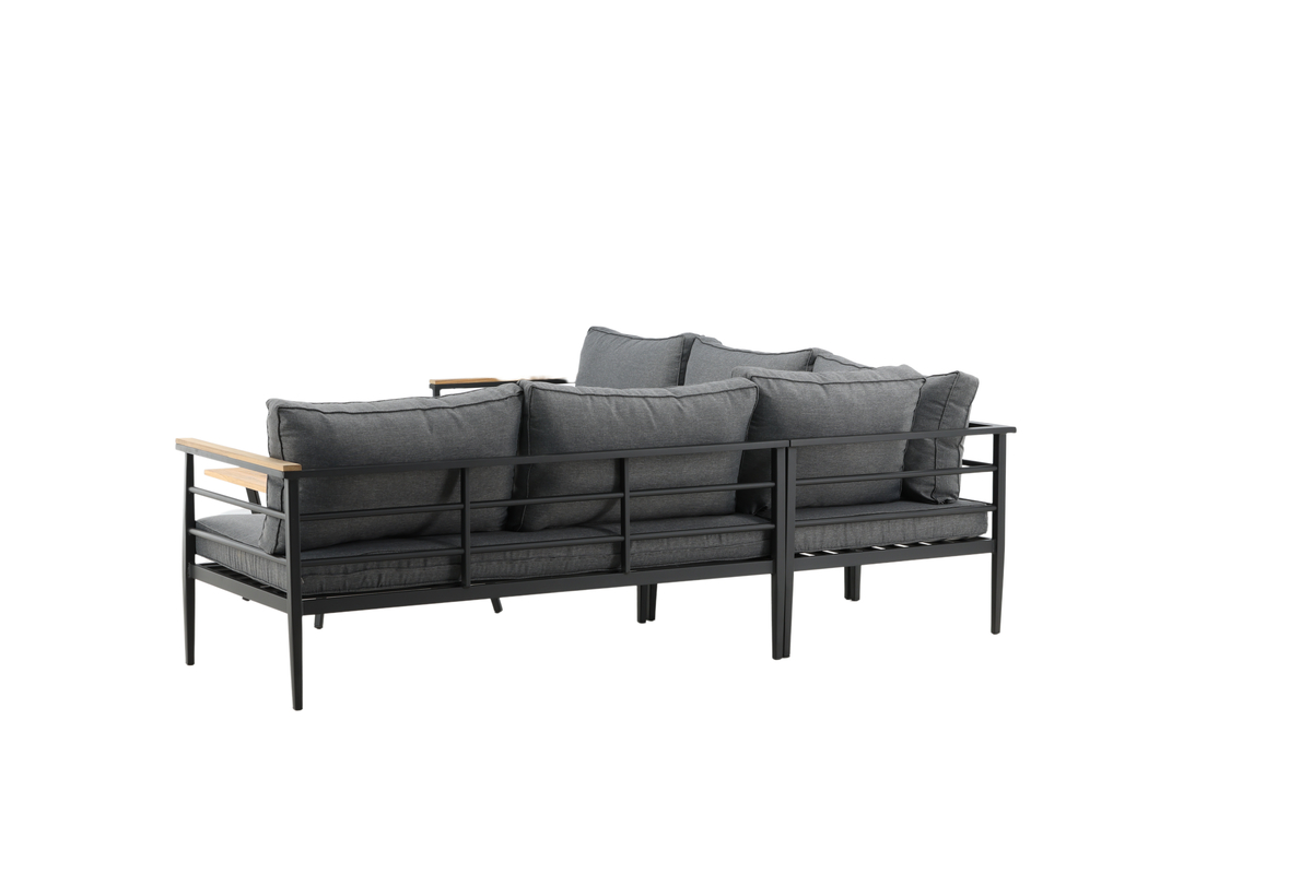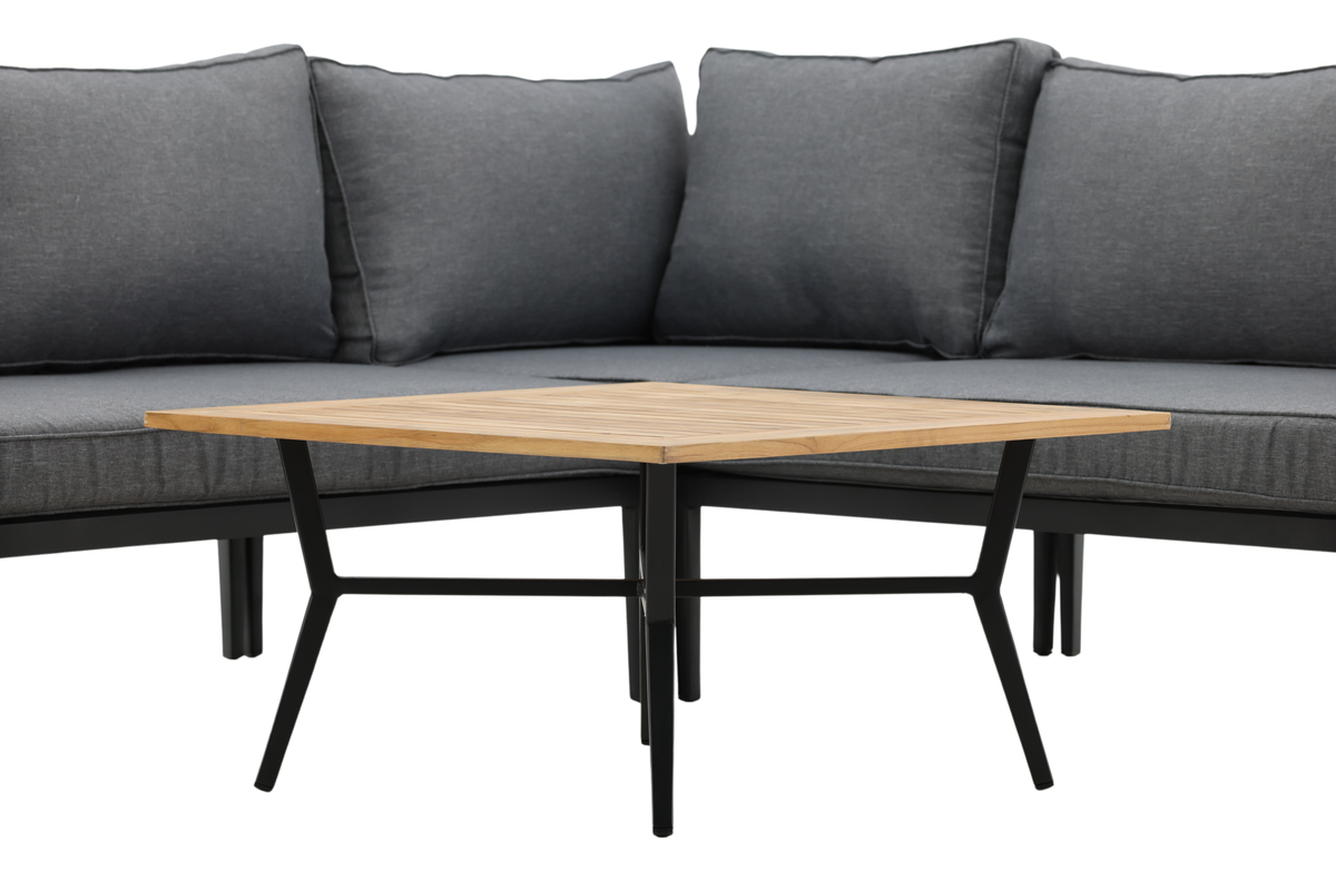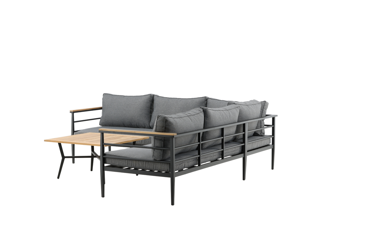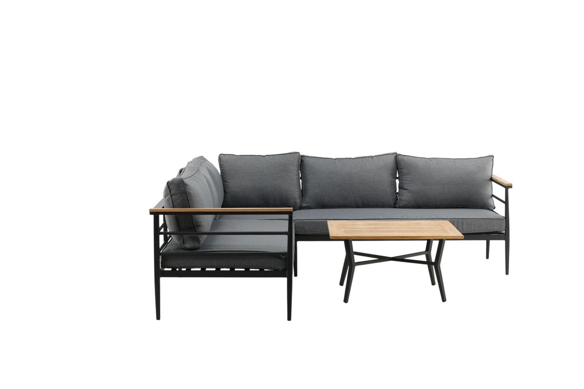 Denna hörnsoffa är en modern loungegrupp som kombinerar stil och komfort för altan, uteplats eller uterum. Med svart pulverlackerad metallstomme, armstöd med teakdetaljer och mjuka grå dynor blir den en inbjudande samlingsplats. Det låga soffbordet med teakskiva kompletterar soffgruppen perfekt och skapar en helhet som fungerar både till fika och middagar utomhus.