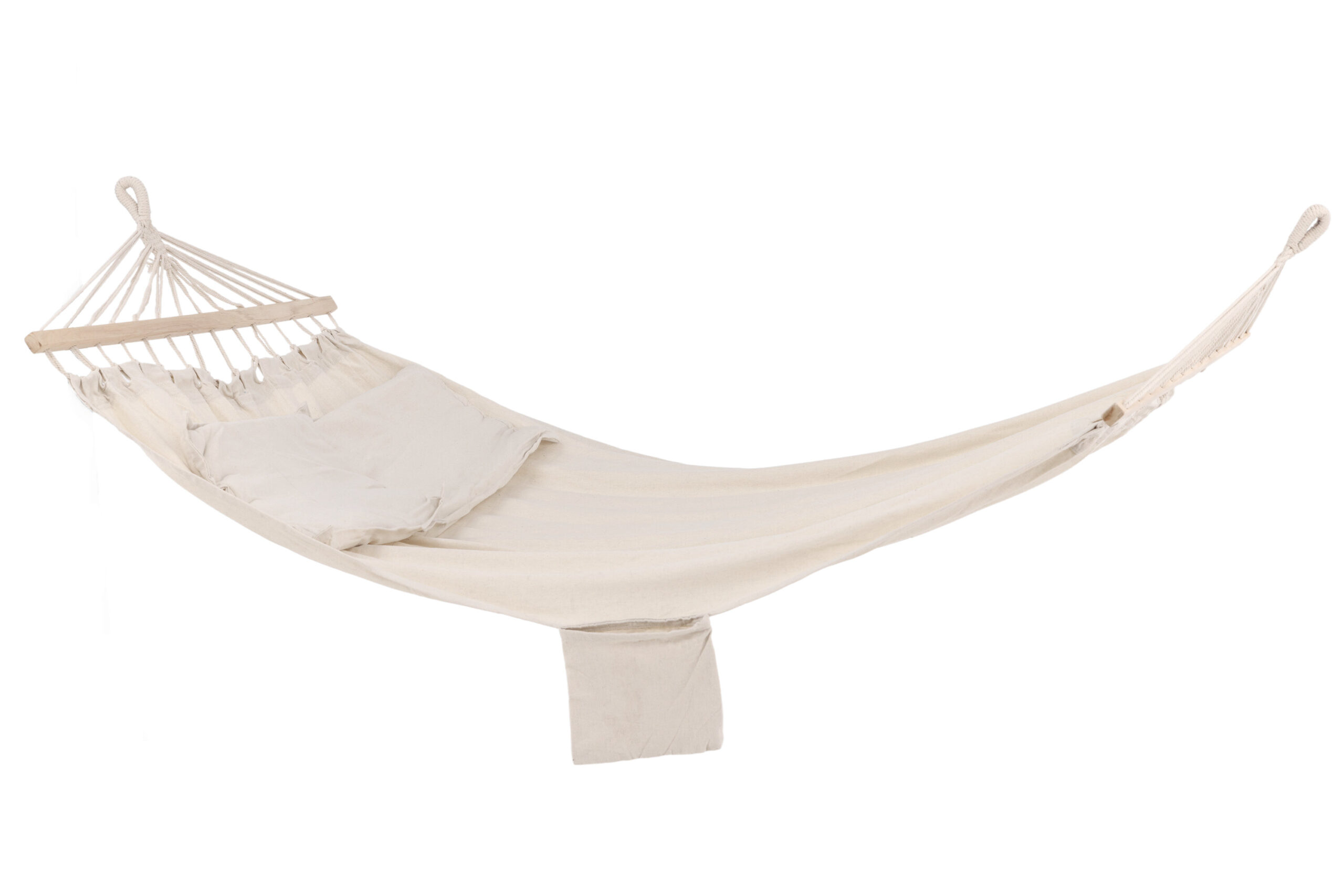 Anini – vår omtyckta hammock i modern design och inbjudande utformning! Den här hammocken erbjuder det bästa av två världar med slitstark material och snygg stil. Tillverkad i bomulls- och polyestertyg i en smäcker vit kulör med träpinnar i vardera ända som sträcker ut tyget. Häng upp den i favorithörnan och njut av avkopplande tid ensam eller tillsammans – Här får ni plats båda två!